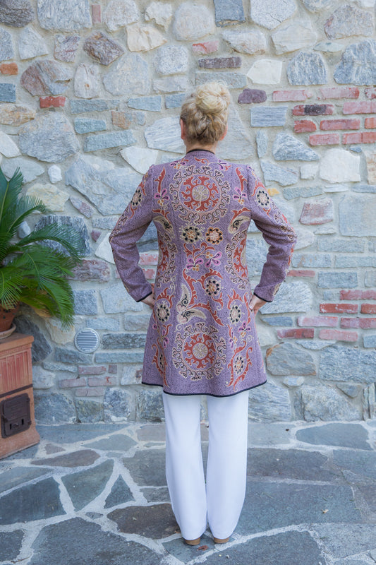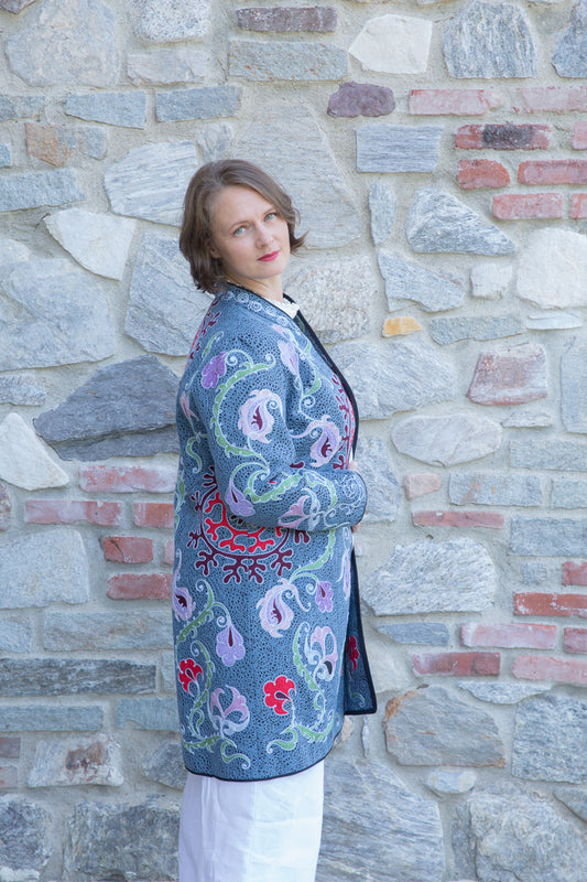 Extraordinary hand-made overcoats, decorated with unique embroidery and fine arabesques. With firm fabric and regular fit, these creations stand out for their dry and elegant lines that enhance the wearer. The bright colors and artisanal details transform each overcoat into an authentic jewel. Each piece is carefully selected and embellished with jewel buttons, to offer an exclusive touch signed JoyFull. Made entirely by hand in Uzbekistan, these pieces are the expression of a unique artisanal tradition.