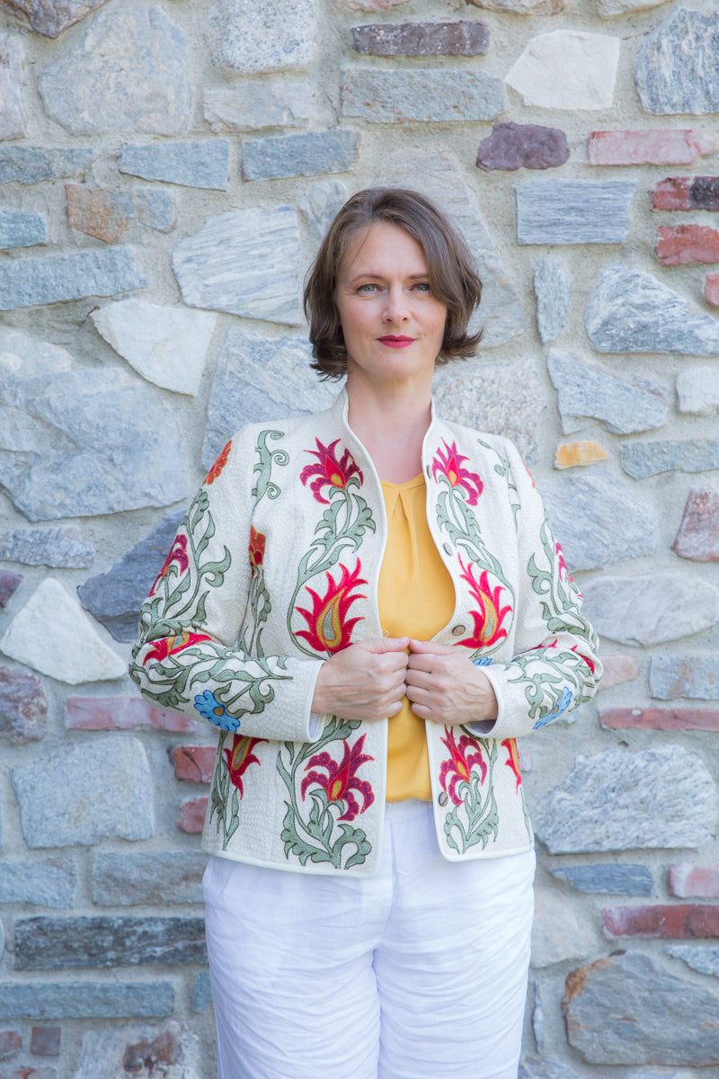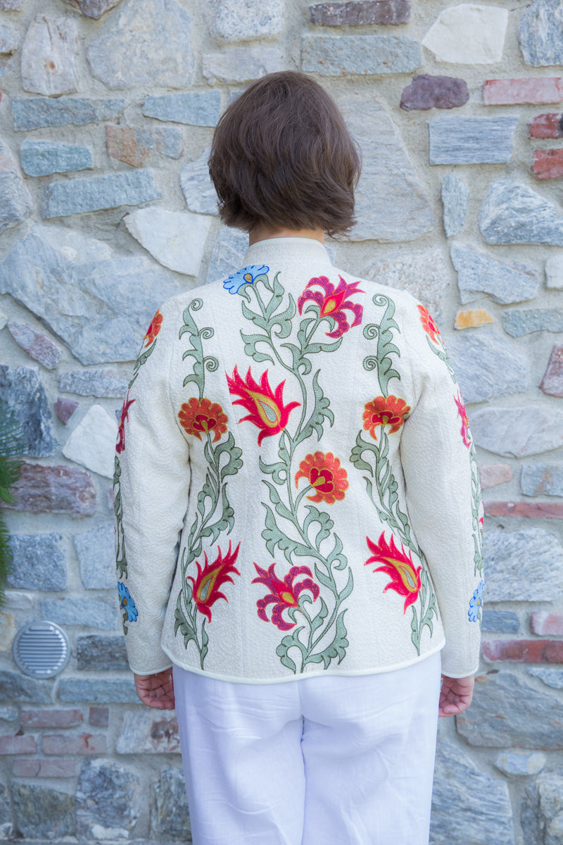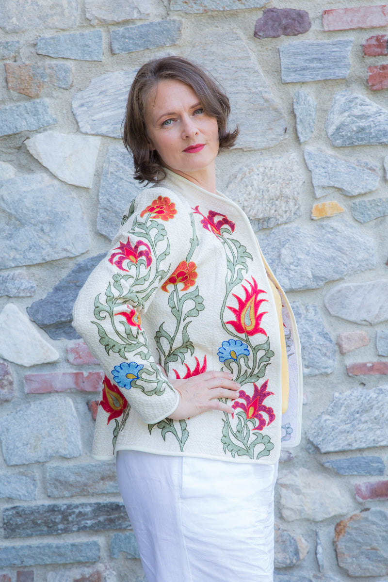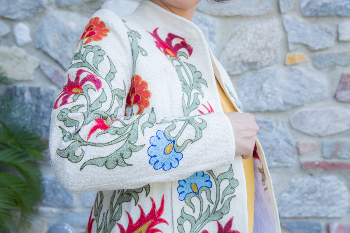 Giacca in cotone, interamente ricamata secondo l'antica tecnica ornamentale uzbeca, che richiamano le decorazioni tradizionali dell'arte di questo Paese. Ogni giacca è unica e si distingue per i ricami particolari, inusuali e accattivanti. Le linee morbide e la vestibilità rilassata rendono questi capi versatili, perfetti per un look sportivo ma anche di tendenza, con grande personalità. Realizzate in tessuto fermo, queste giacche sono interamente fatte a mano in Uzbekistan e arricchite da bottoni gioiello selezionati per esaltare l'esclusività della collezione JoyFull.