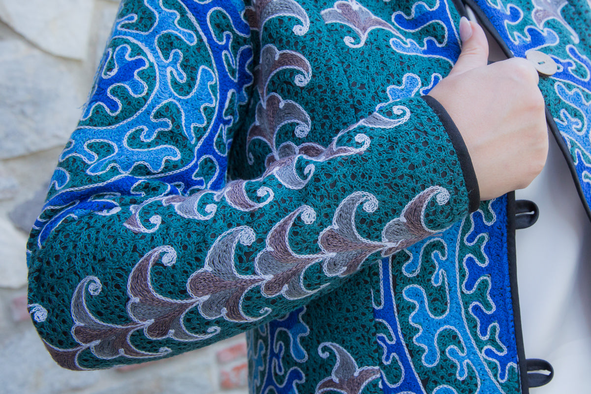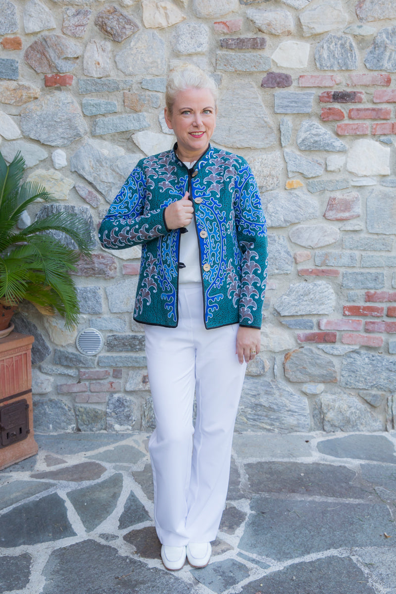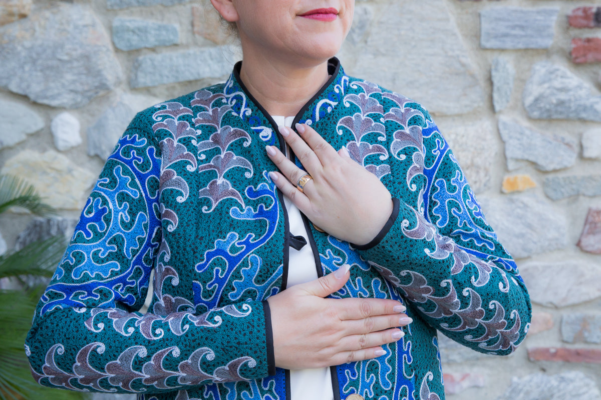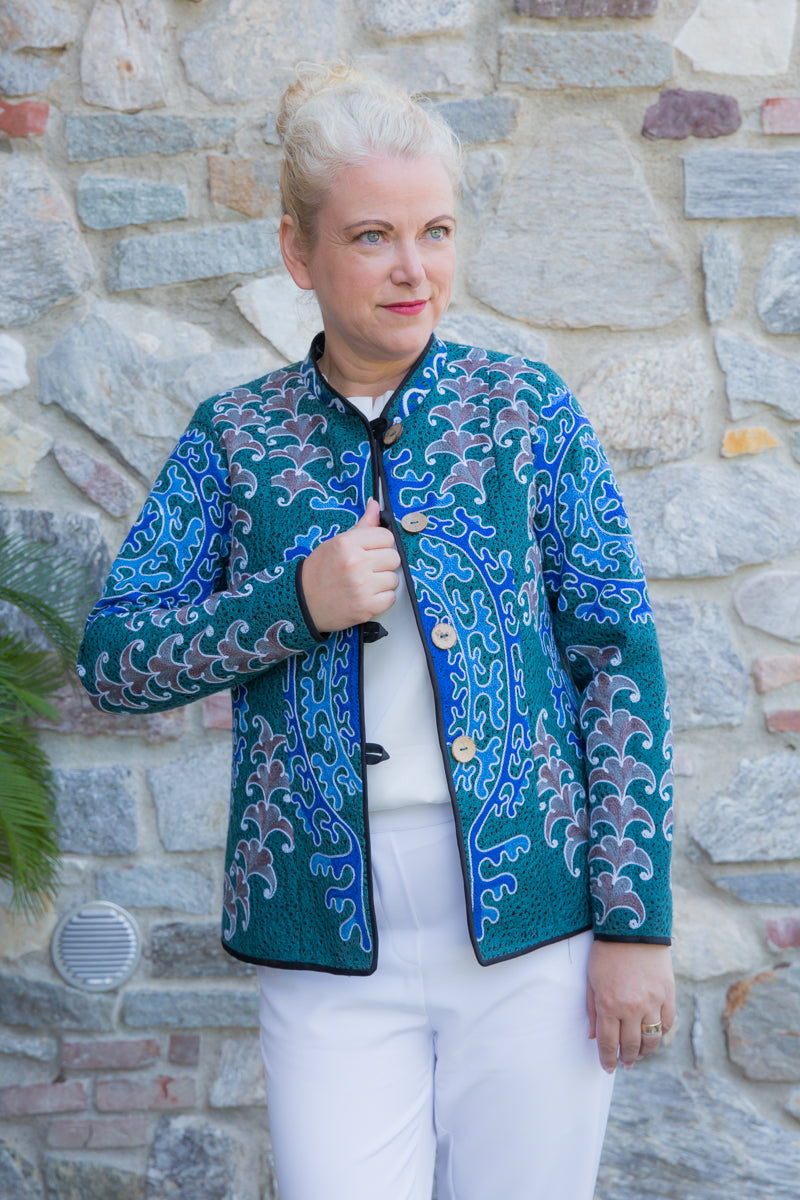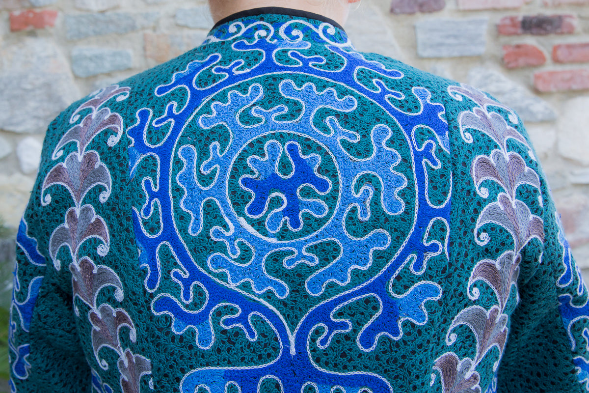 Giacca in cotone, interamente ricamata secondo l'antica tecnica ornamentale uzbeca, che richiamano le decorazioni tradizionali dell'arte di questo Paese. Ogni giacca è unica e si distingue per i ricami particolari, inusuali e accattivanti. Le linee morbide e la vestibilità rilassata rendono questi capi versatili, perfetti per un look sportivo ma anche di tendenza, con grande personalità. Realizzate in tessuto fermo, queste giacche sono interamente fatte a mano in Uzbekistan e arricchite da bottoni gioiello selezionati per esaltare l'esclusività della collezione JoyFull.