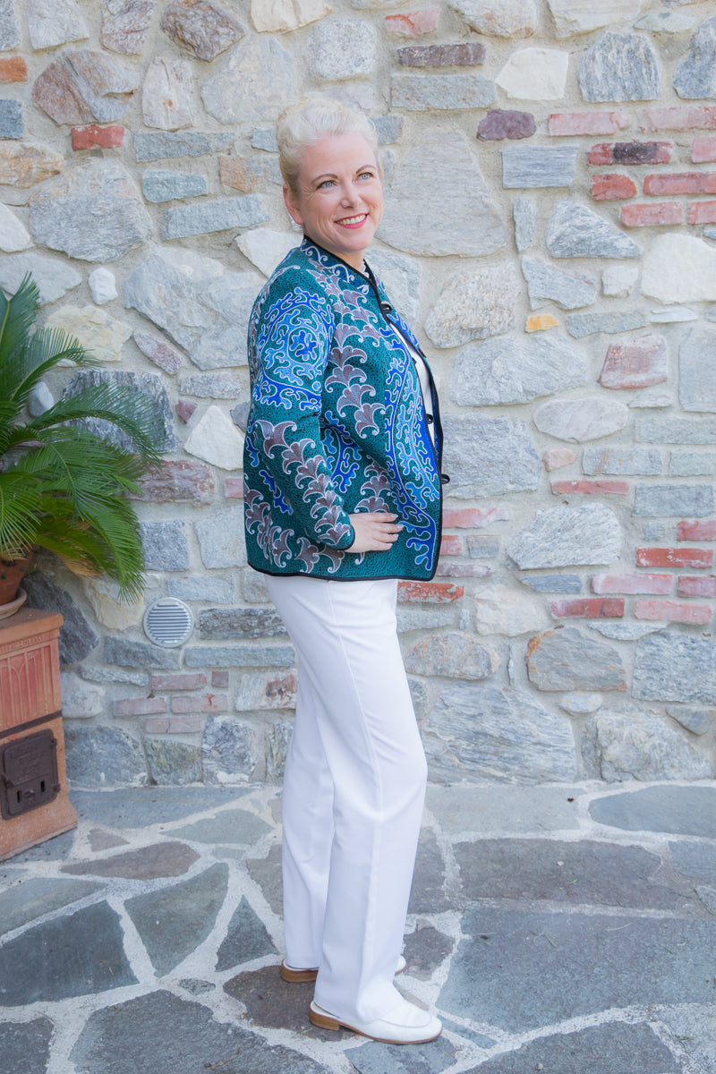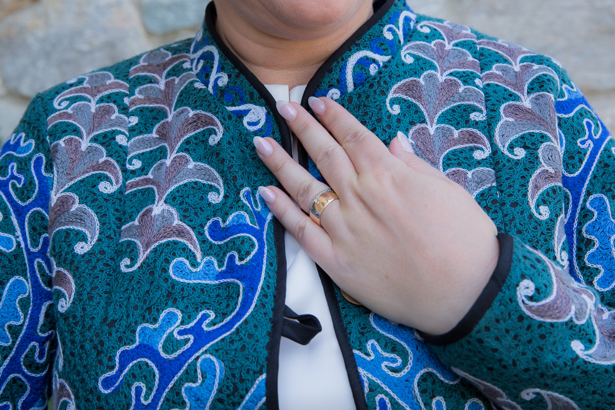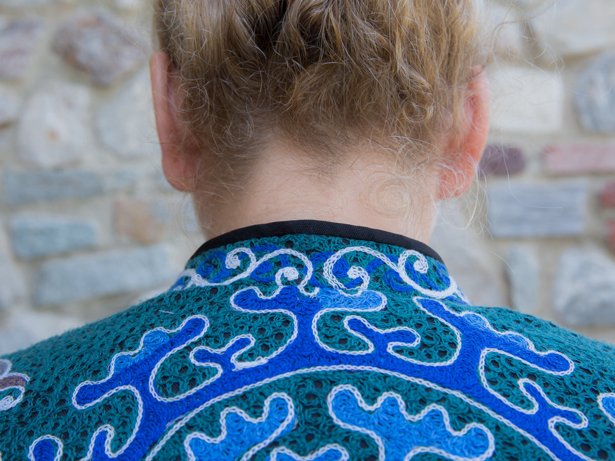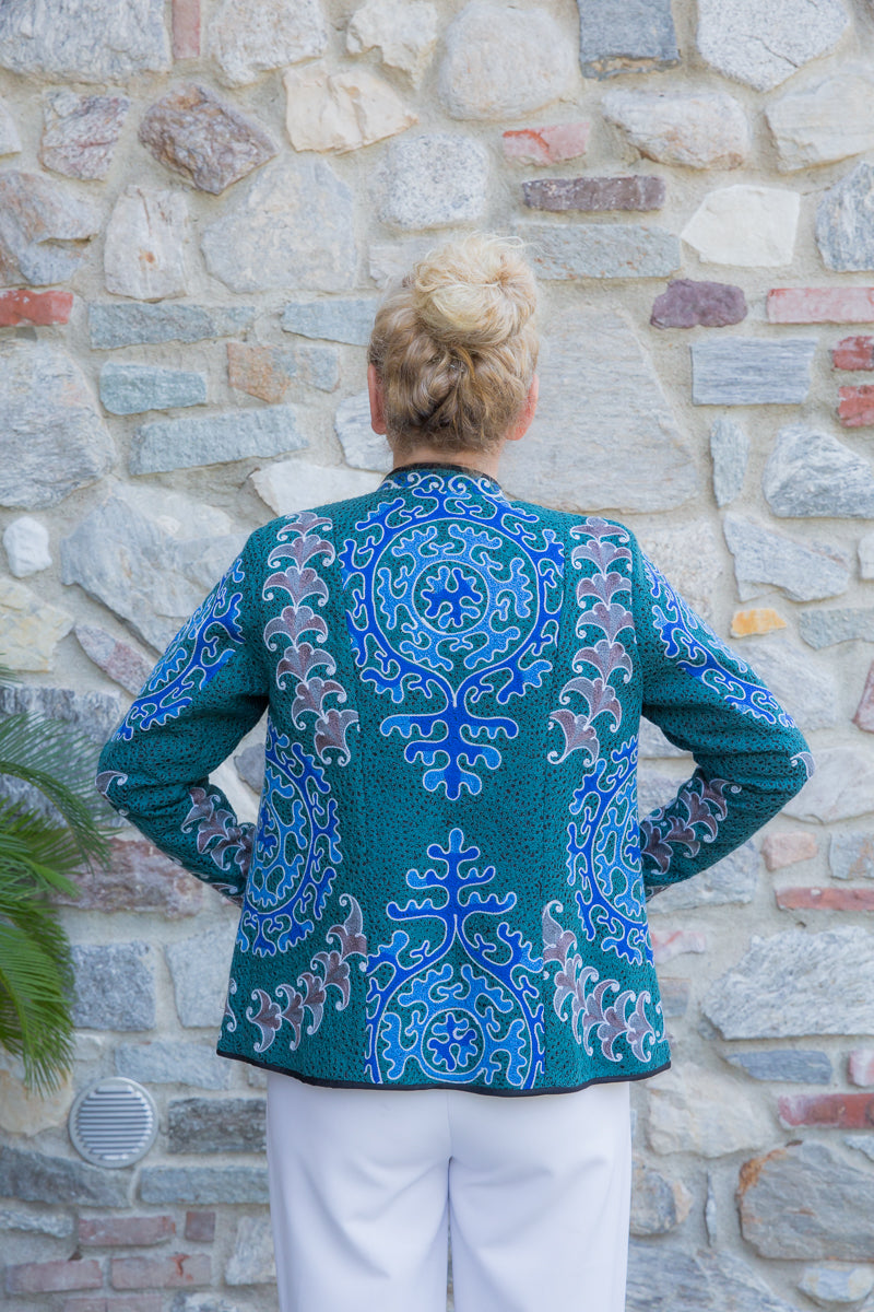 Giacca in cotone, interamente ricamata secondo l'antica tecnica ornamentale uzbeca, che richiamano le decorazioni tradizionali dell'arte di questo Paese. Ogni giacca è unica e si distingue per i ricami particolari, inusuali e accattivanti. Le linee morbide e la vestibilità rilassata rendono questi capi versatili, perfetti per un look sportivo ma anche di tendenza, con grande personalità. Realizzate in tessuto fermo, queste giacche sono interamente fatte a mano in Uzbekistan e arricchite da bottoni gioiello selezionati per esaltare l'esclusività della collezione JoyFull.