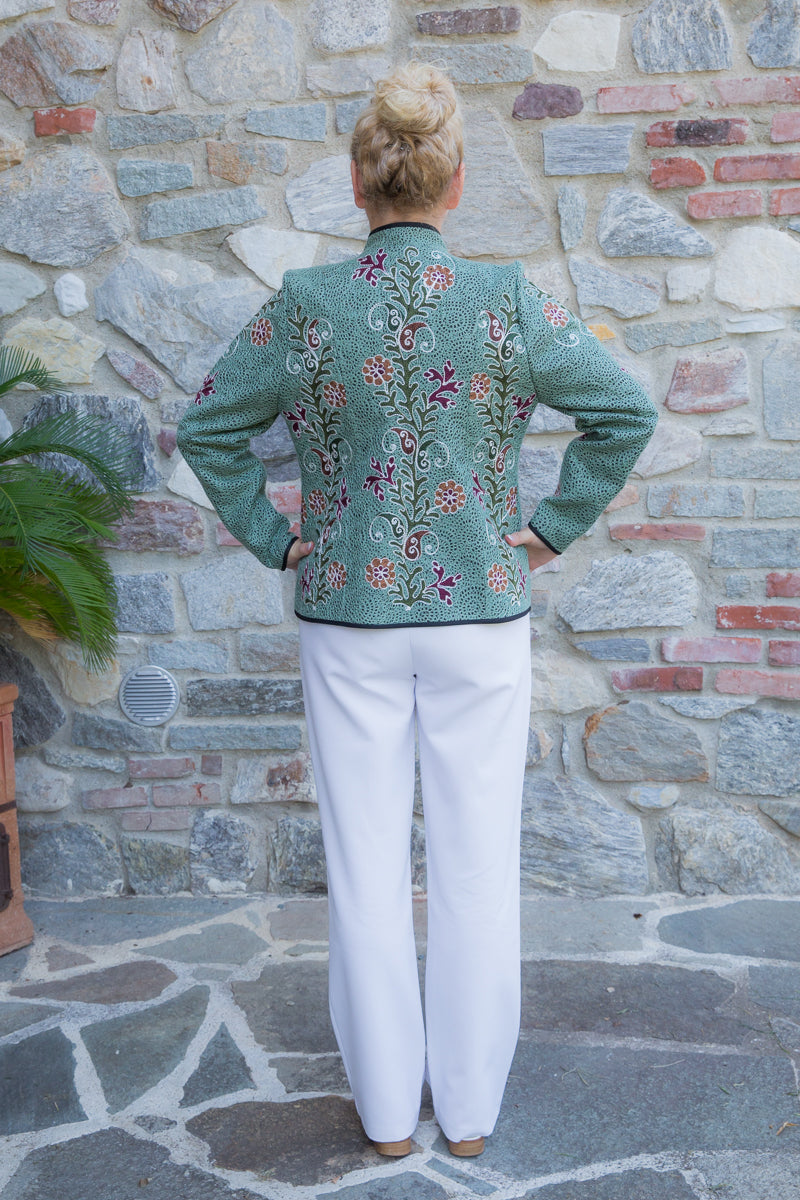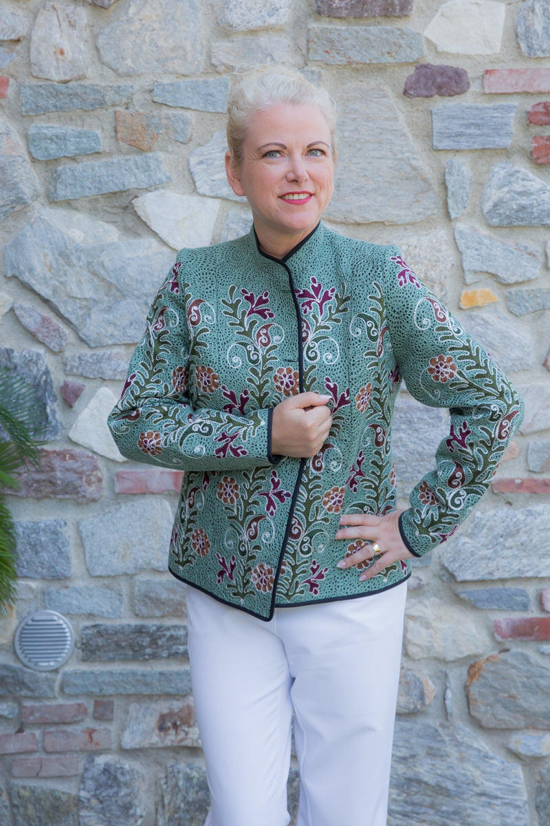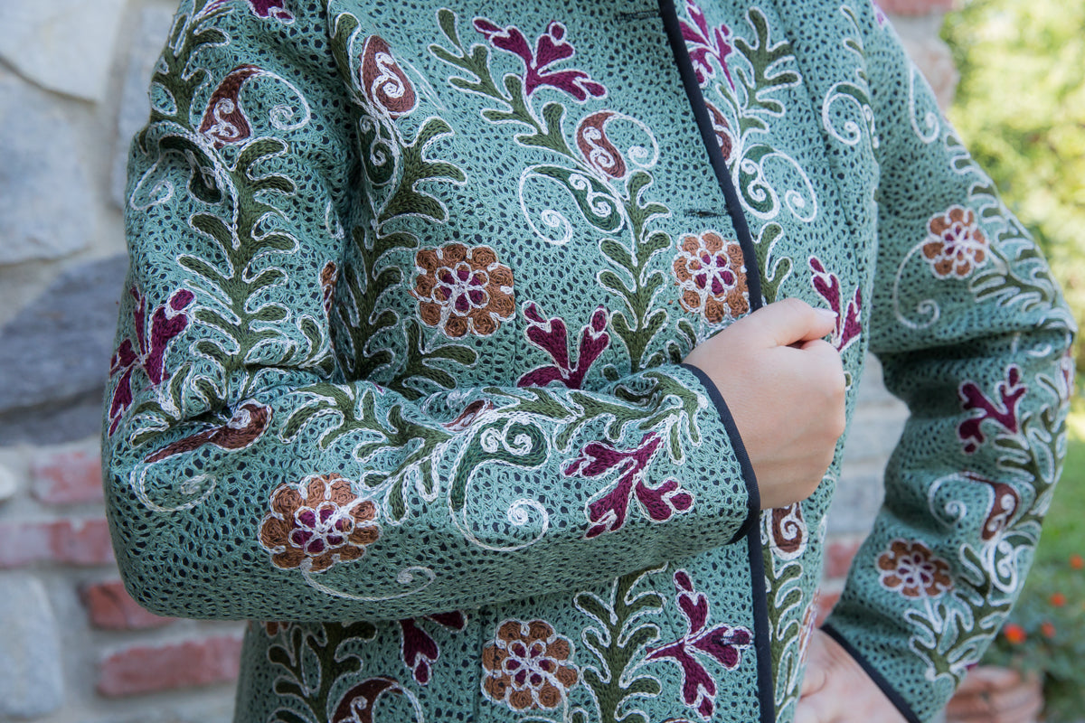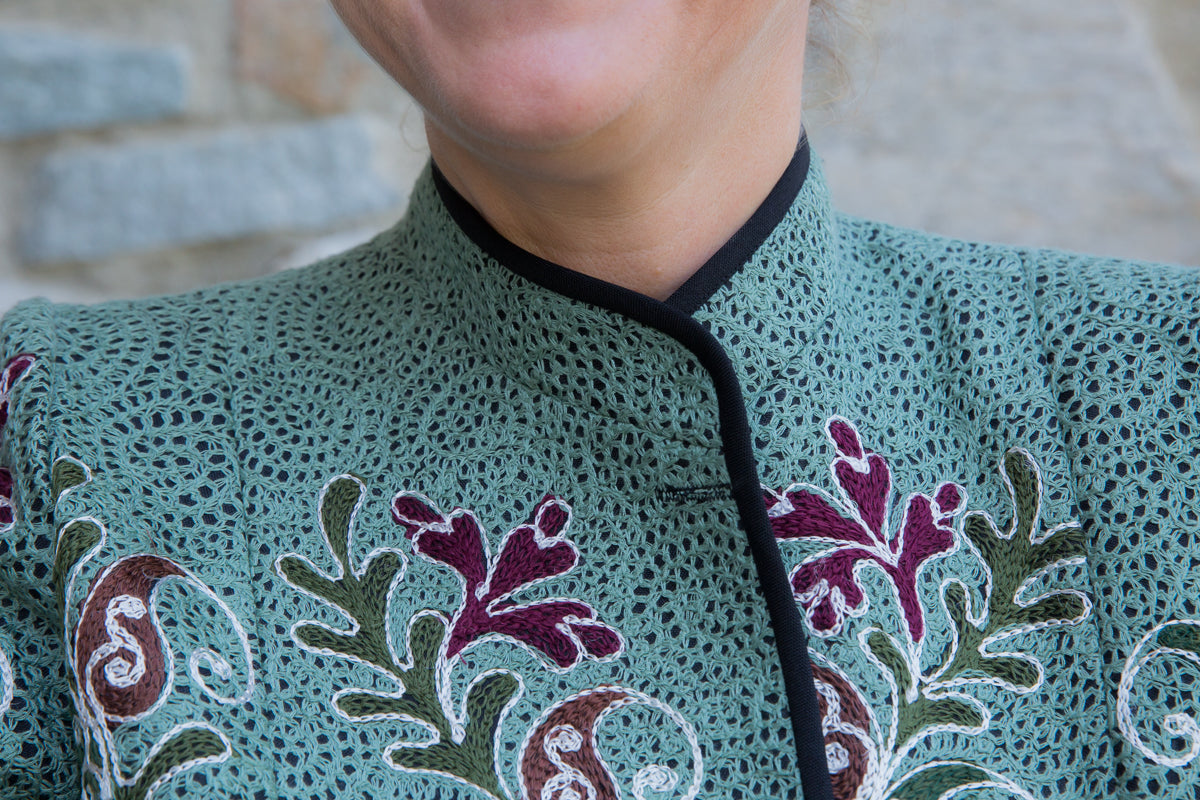 Giacca in cotone, interamente ricamata secondo l'antica tecnica ornamentale uzbeca, che richiamano le decorazioni tradizionali dell'arte di questo Paese. Ogni giacca è unica e si distingue per i ricami particolari, inusuali e accattivanti. Le linee morbide e la vestibilità rilassata rendono questi capi versatili, perfetti per un look sportivo ma anche di tendenza, con grande personalità. Realizzate in tessuto fermo, queste giacche sono interamente fatte a mano in Uzbekistan e arricchite da bottoni gioiello selezionati per esaltare l'esclusività della collezione JoyFull.