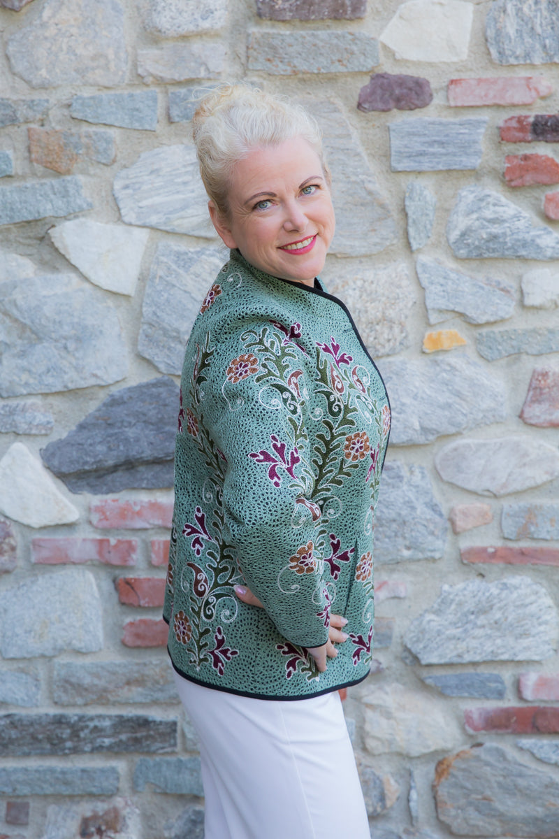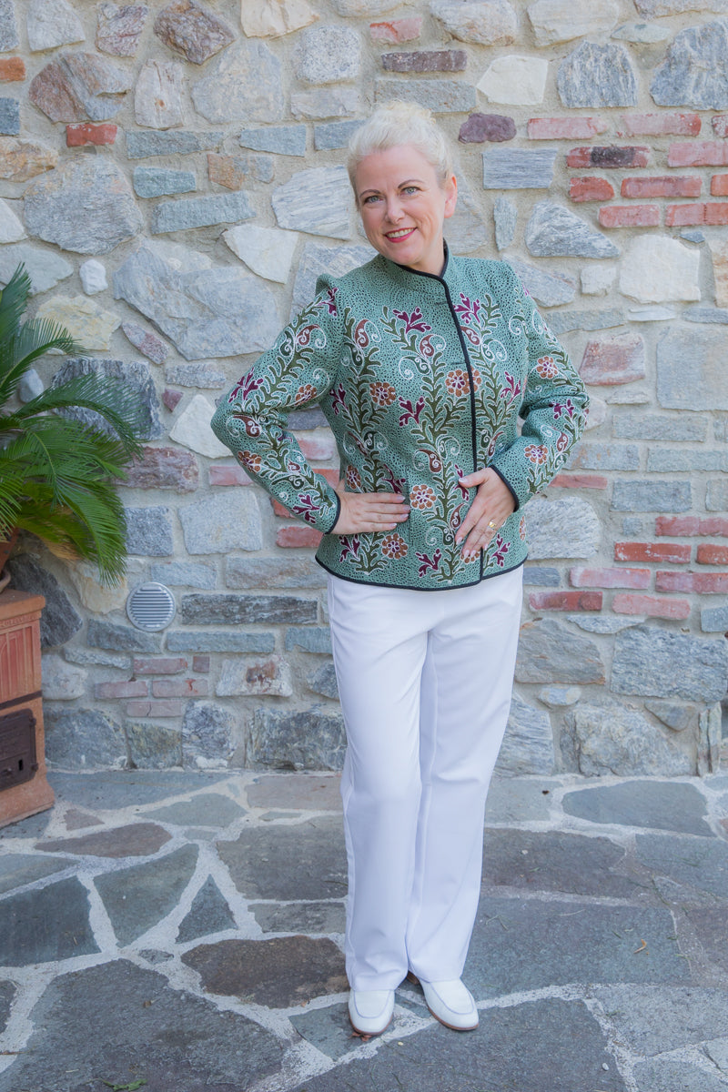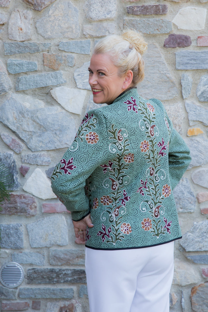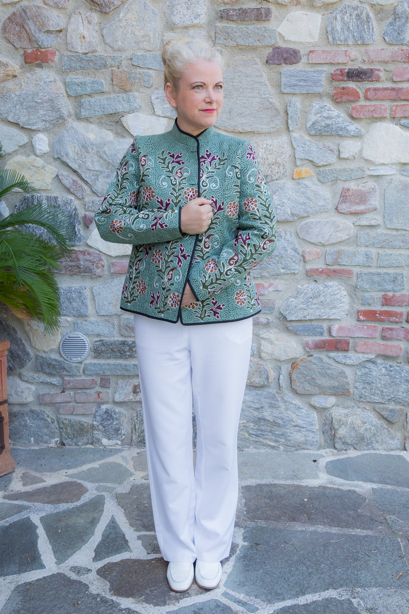 Giacca in cotone, interamente ricamata secondo l'antica tecnica ornamentale uzbeca, che richiamano le decorazioni tradizionali dell'arte di questo Paese. Ogni giacca è unica e si distingue per i ricami particolari, inusuali e accattivanti. Le linee morbide e la vestibilità rilassata rendono questi capi versatili, perfetti per un look sportivo ma anche di tendenza, con grande personalità. Realizzate in tessuto fermo, queste giacche sono interamente fatte a mano in Uzbekistan e arricchite da bottoni gioiello selezionati per esaltare l'esclusività della collezione JoyFull.
