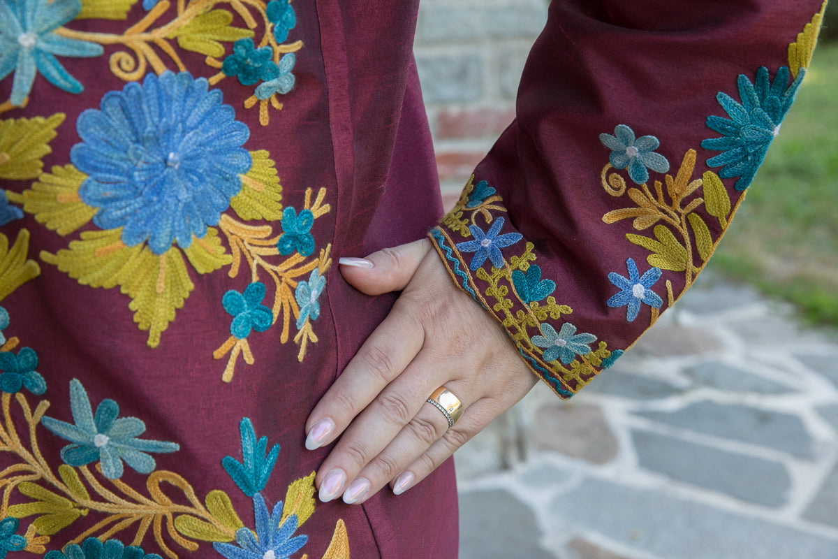 Preferisci il lavaggio a secco per evitare danni ai tessuti pregiati e alle decorazioni. Evita l'esposizione diretta alla luce solare per lunghi periodi e conservala in un luogo fresco e asciutto, al riparo dall'umidità. Stirare a bassa temperatura sul rovescio o utilizzare un panno protettivo.