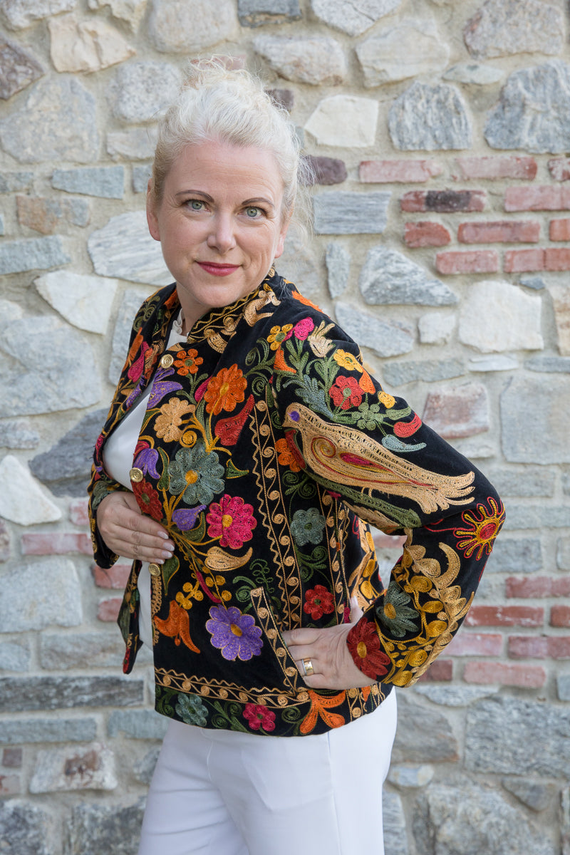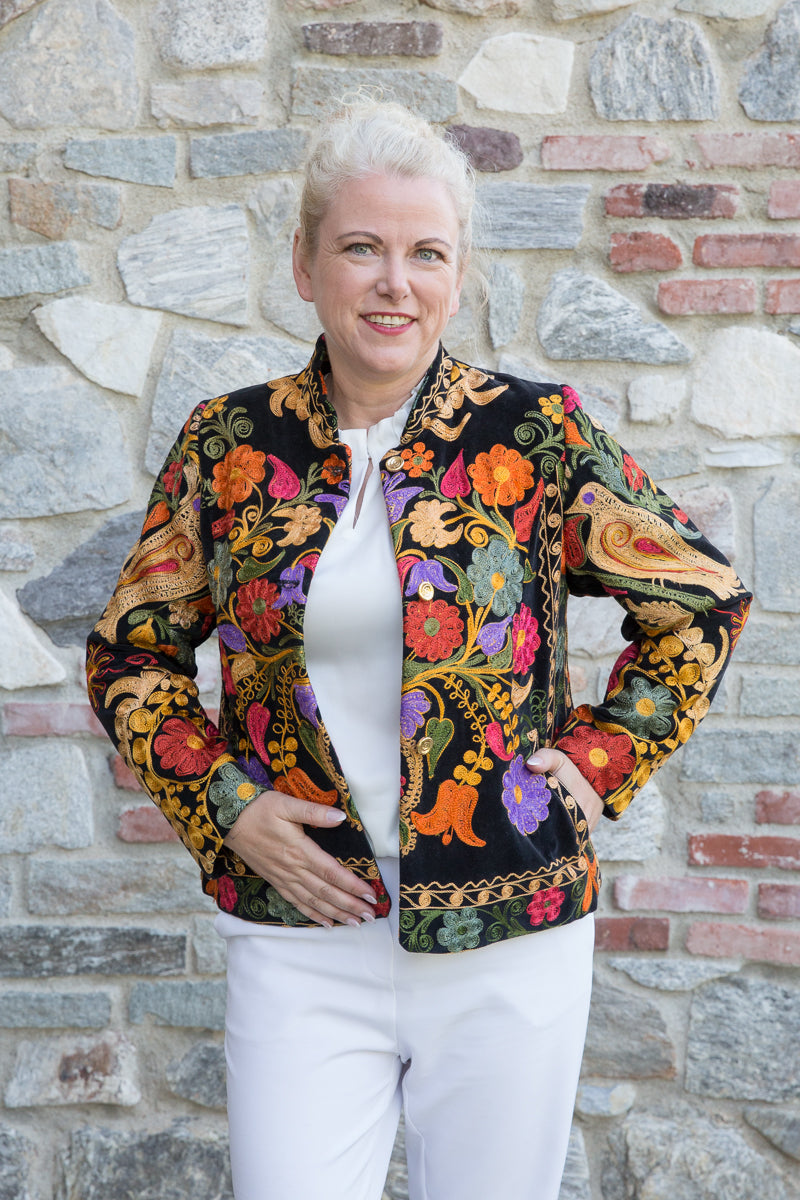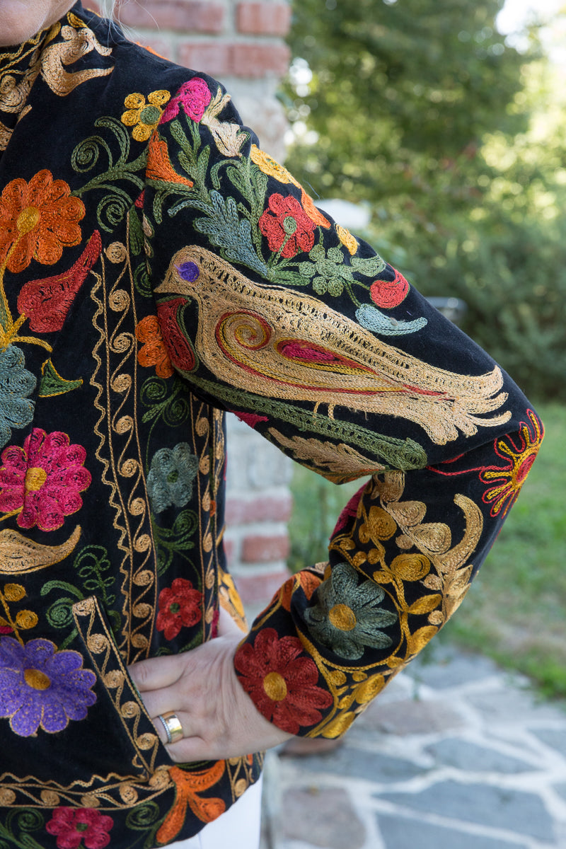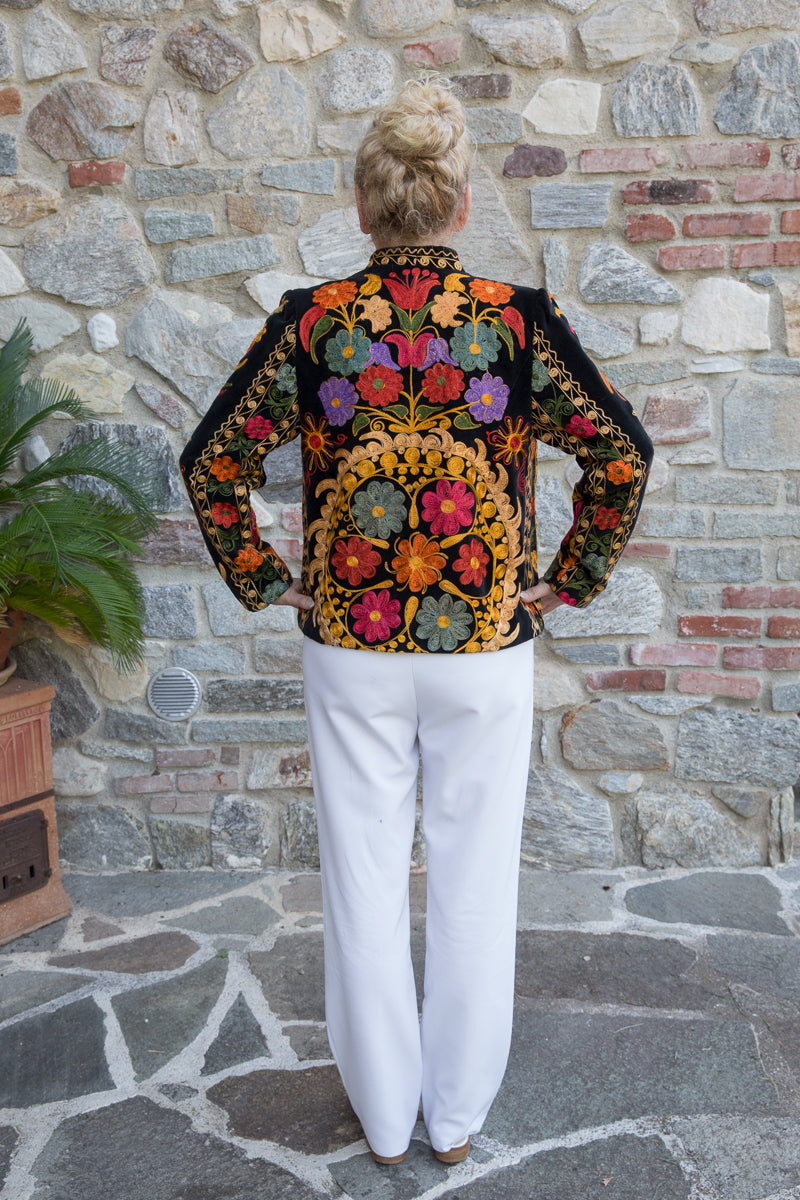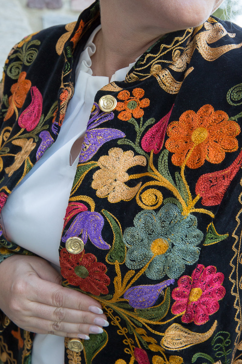 Questa giacca in velluto modello blazer combina morbidezza e fascino, arricchita da colori vivaci e ricami straordinari. Indossandola, si entra in un mondo di storia e tradizione tessile, dove ogni capo esprime unicità ed esclusività. La scelta accurata di velluti corposi, ricami pregiati e dettagli raffinati garantisce una qualità superiore. I bottoni originali sono stati sostituiti con eleganti bottoni gioiello, accuratamente selezionati per offrire un tocco di classe inimitabile. Ogni giacca JoyFull è scelta singolarmente per soddisfare i più alti standard di qualità.