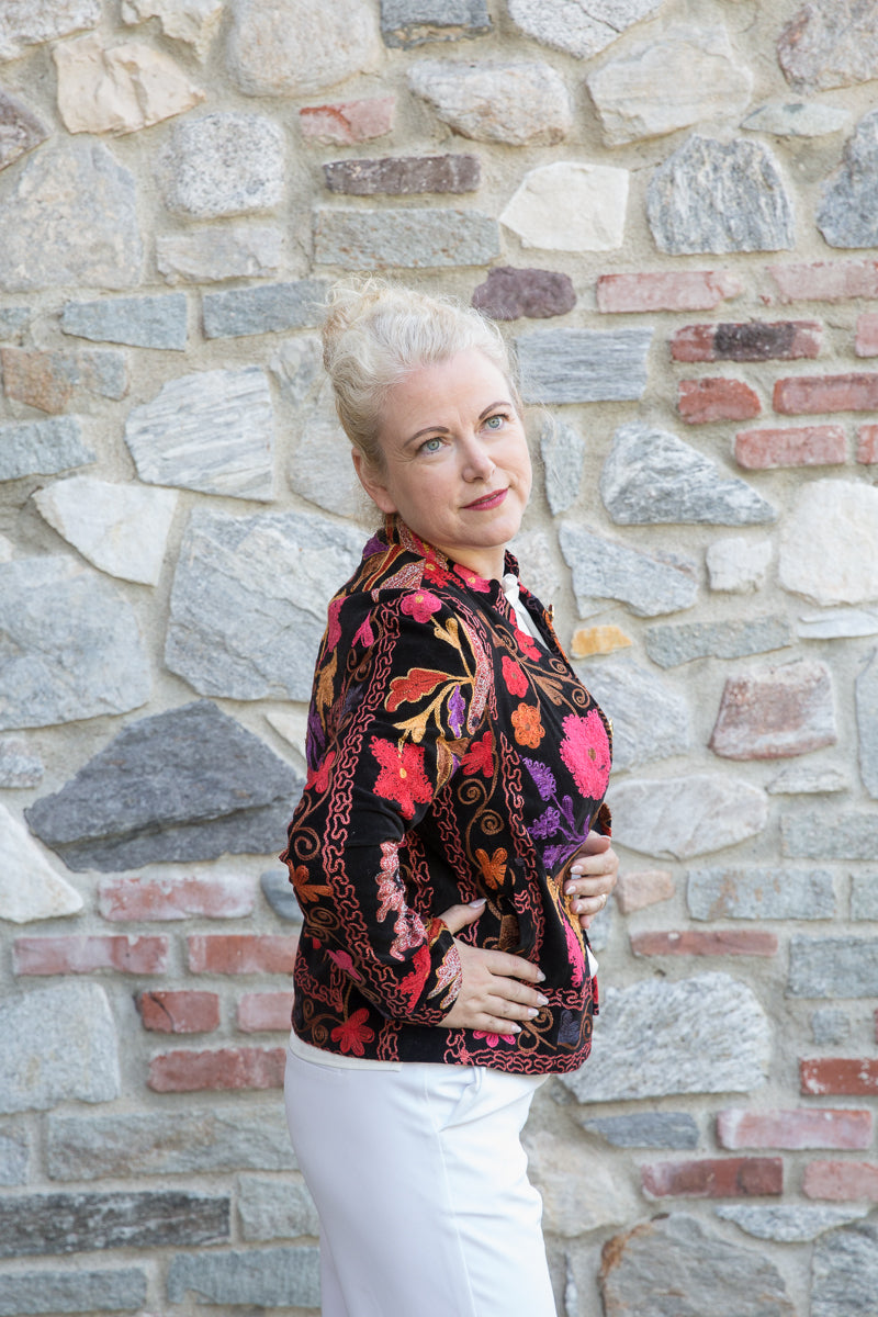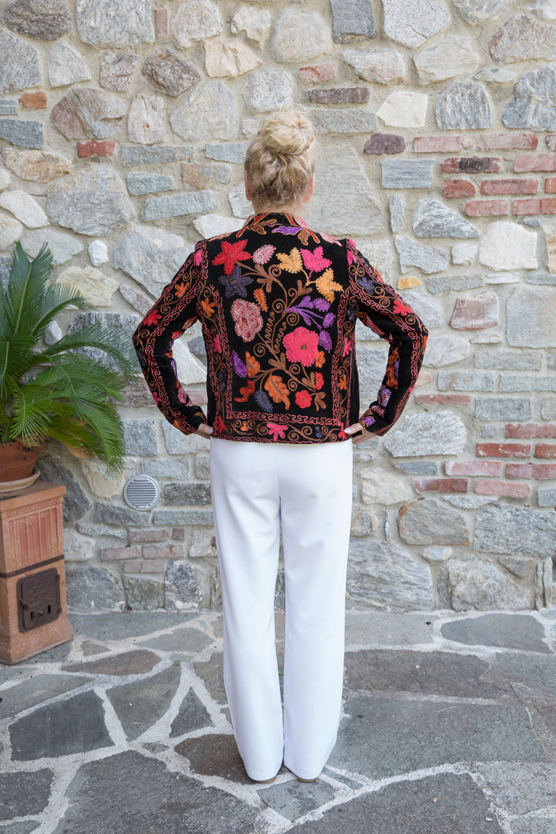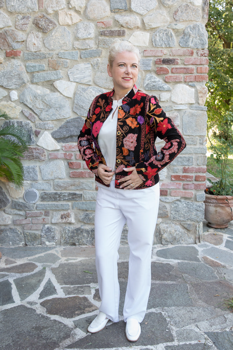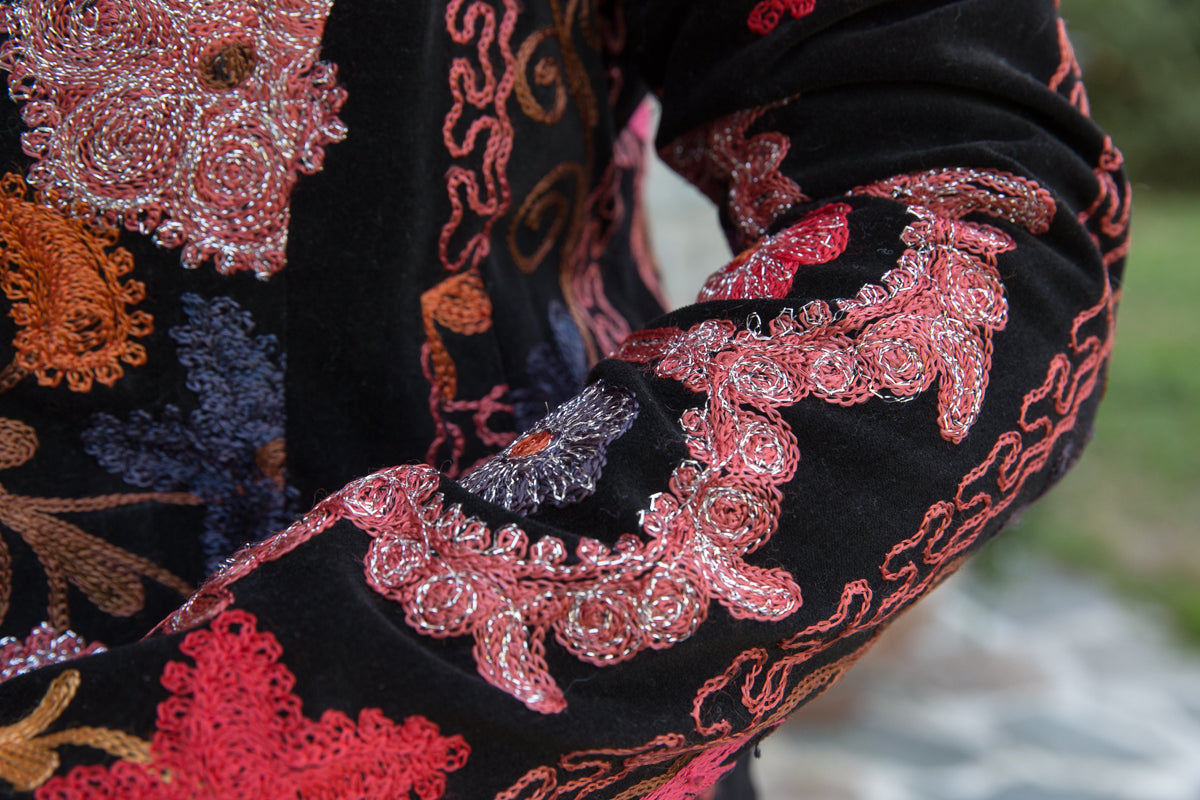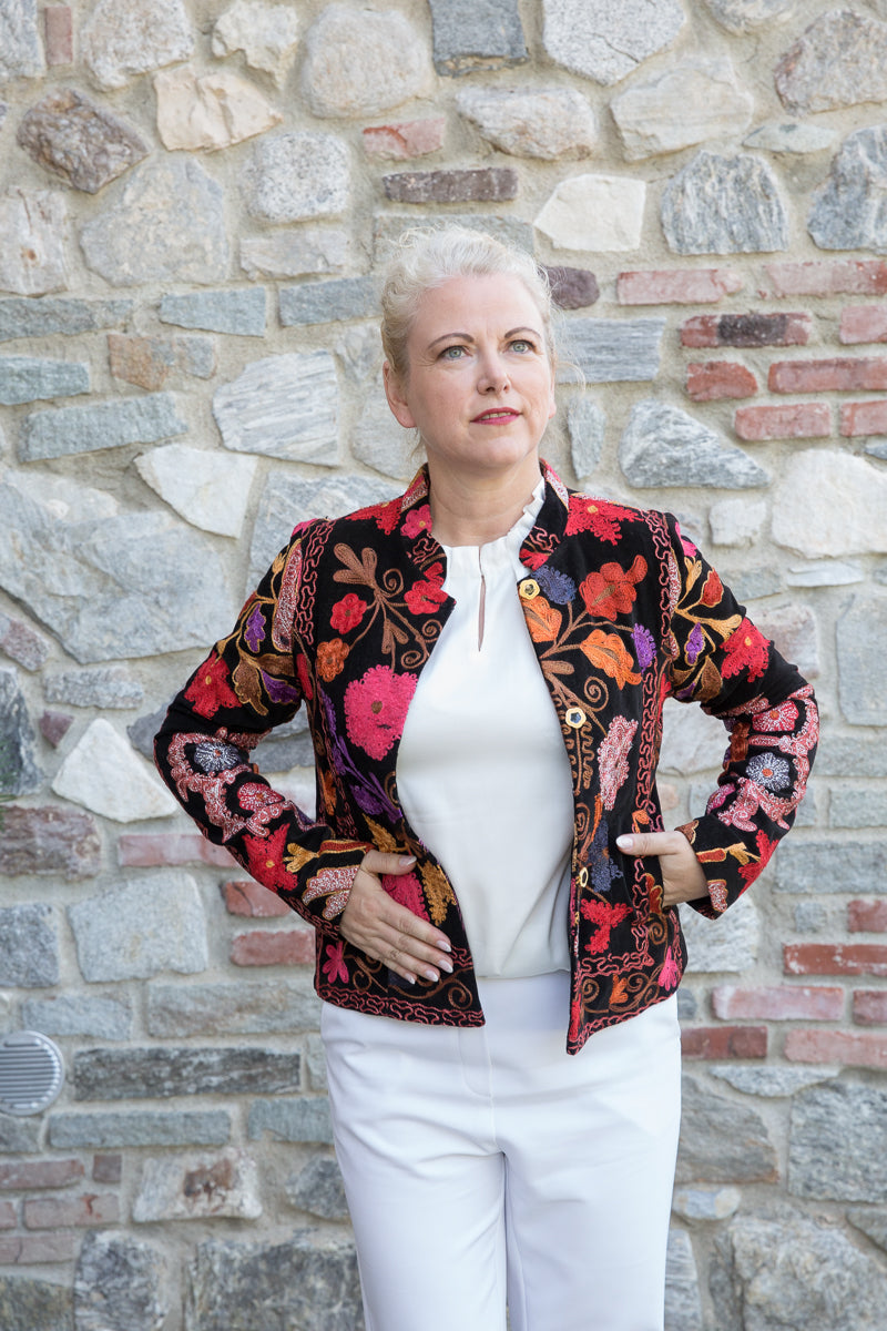 Questa giacca in velluto modello blazer combina morbidezza e fascino, arricchita da colori vivaci e ricami straordinari. Indossandola, si entra in un mondo di storia e tradizione tessile, dove ogni capo esprime unicità ed esclusività. La scelta accurata di velluti corposi, ricami pregiati e dettagli raffinati garantisce una qualità superiore. I bottoni originali sono stati sostituiti con eleganti bottoni gioiello, accuratamente selezionati per offrire un tocco di classe inimitabile. Ogni giacca JoyFull è scelta singolarmente per soddisfare i più alti standard di qualità.