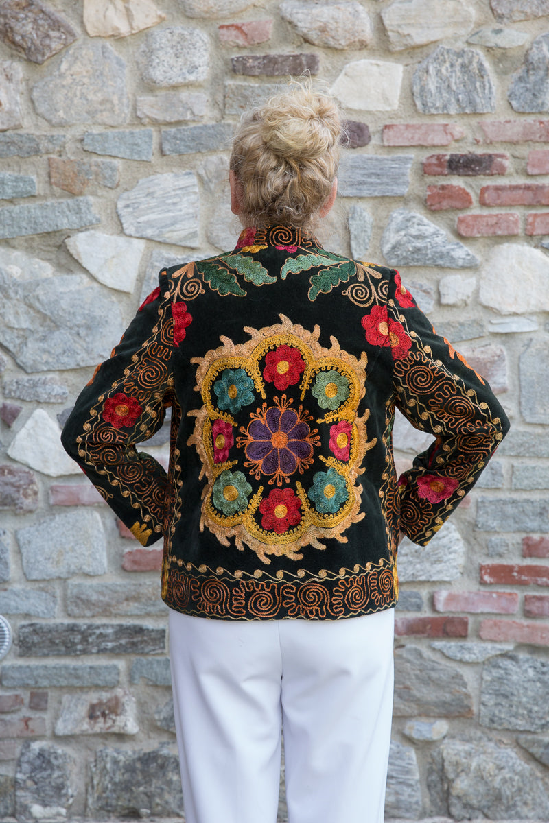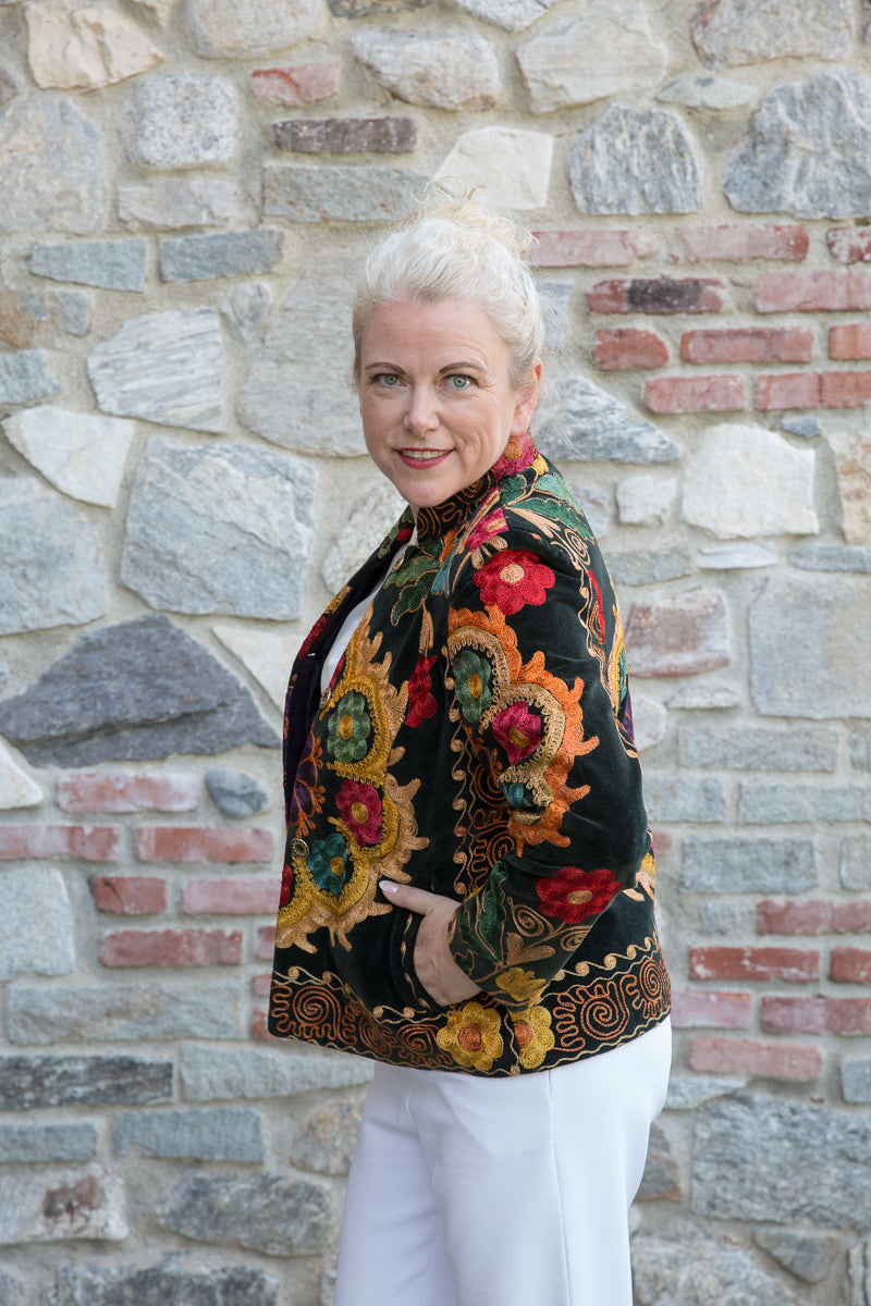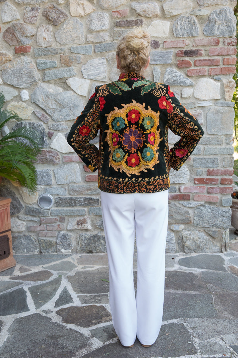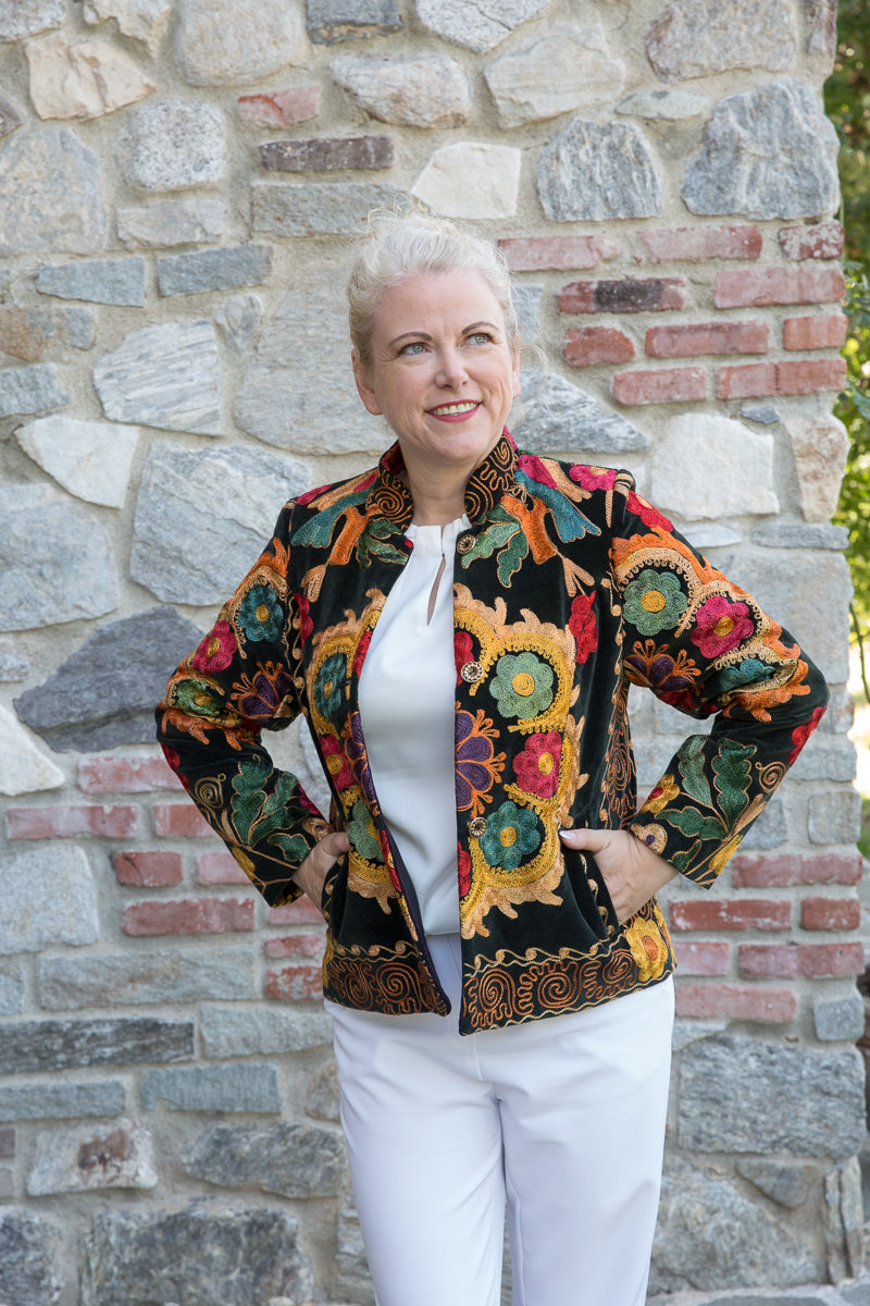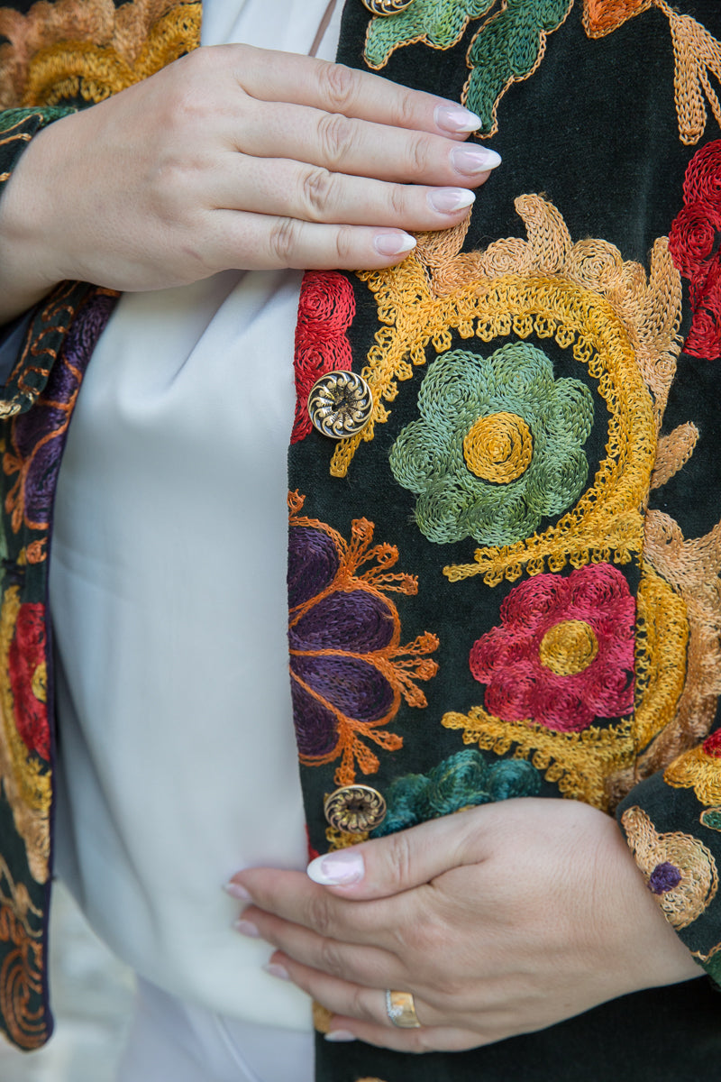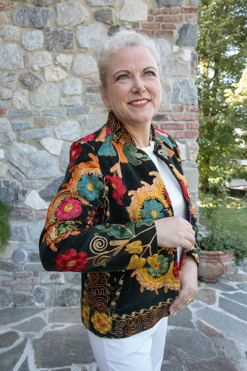 Questa giacca in velluto modello blazer combina morbidezza e fascino, arricchita da colori vivaci e ricami straordinari. Indossandola, si entra in un mondo di storia e tradizione tessile, dove ogni capo esprime unicità ed esclusività. La scelta accurata di velluti corposi, ricami pregiati e dettagli raffinati garantisce una qualità superiore. I bottoni originali sono stati sostituiti con eleganti bottoni gioiello, accuratamente selezionati per offrire un tocco di classe inimitabile. Ogni giacca JoyFull è scelta singolarmente per soddisfare i più alti standard di qualità.