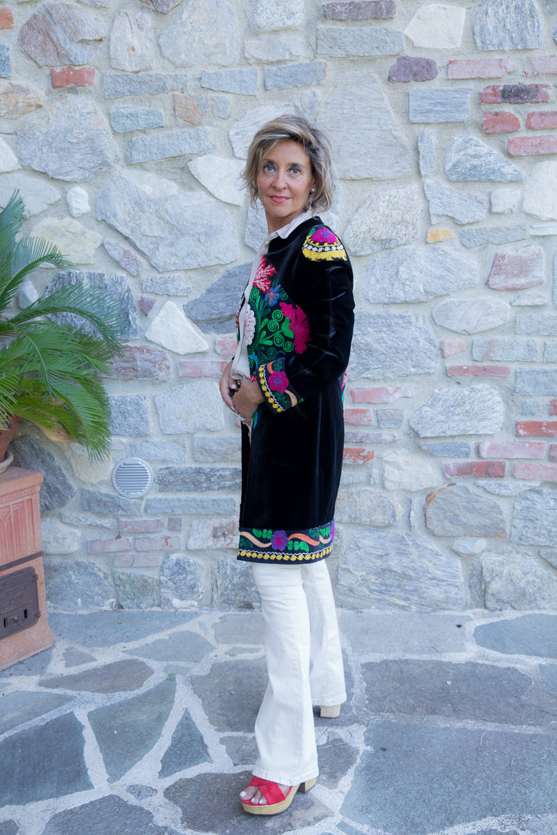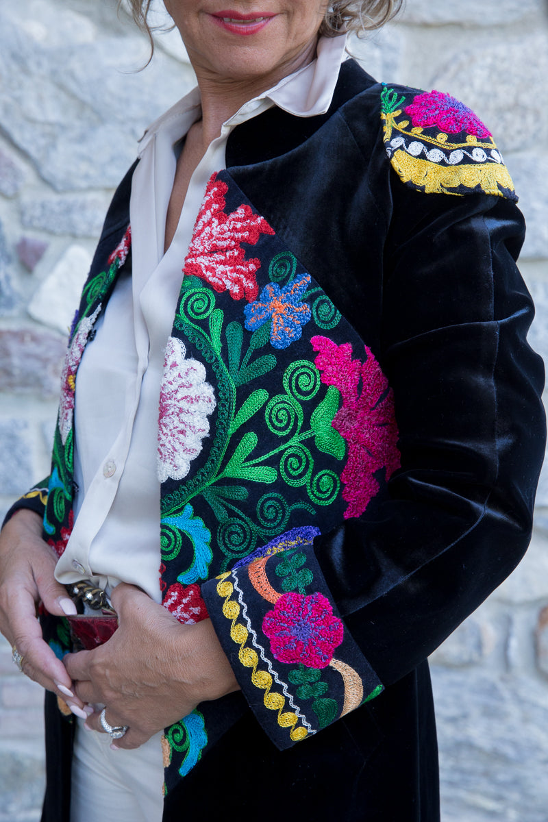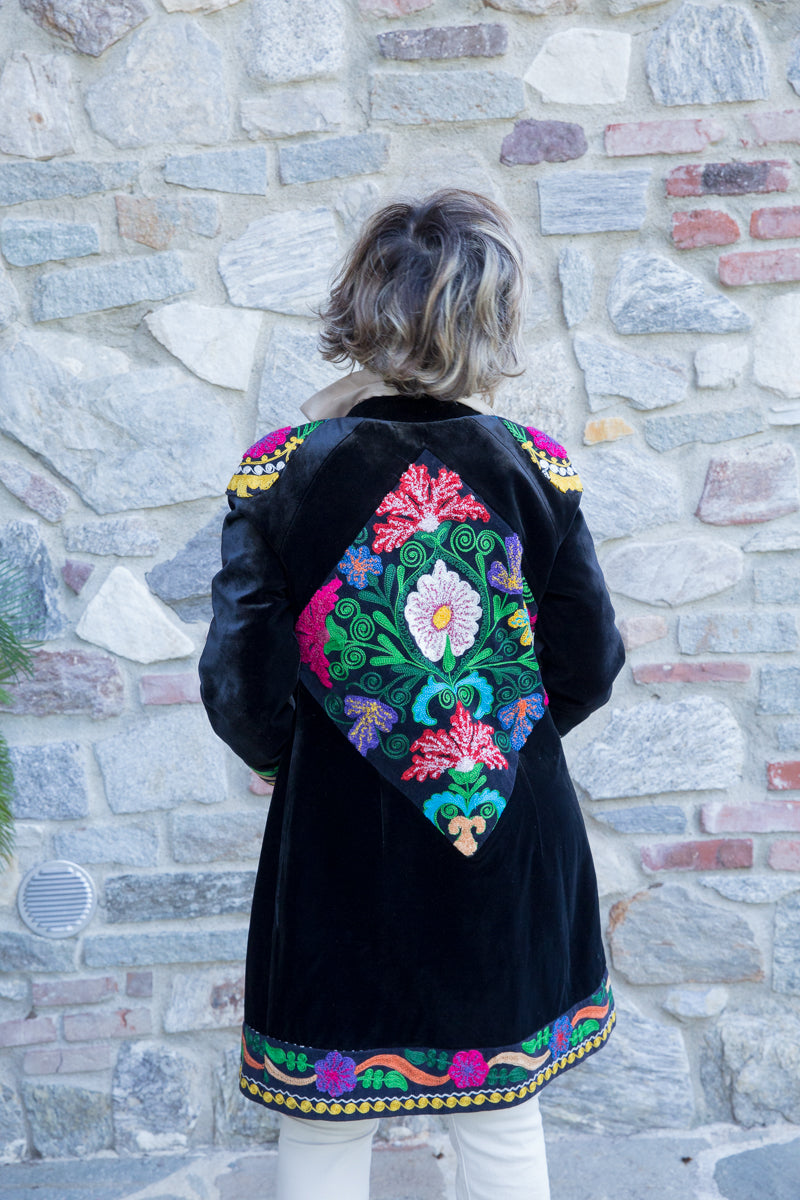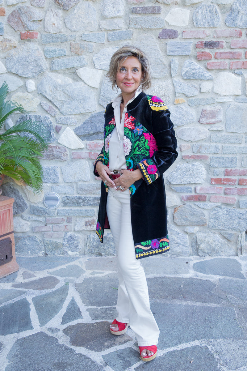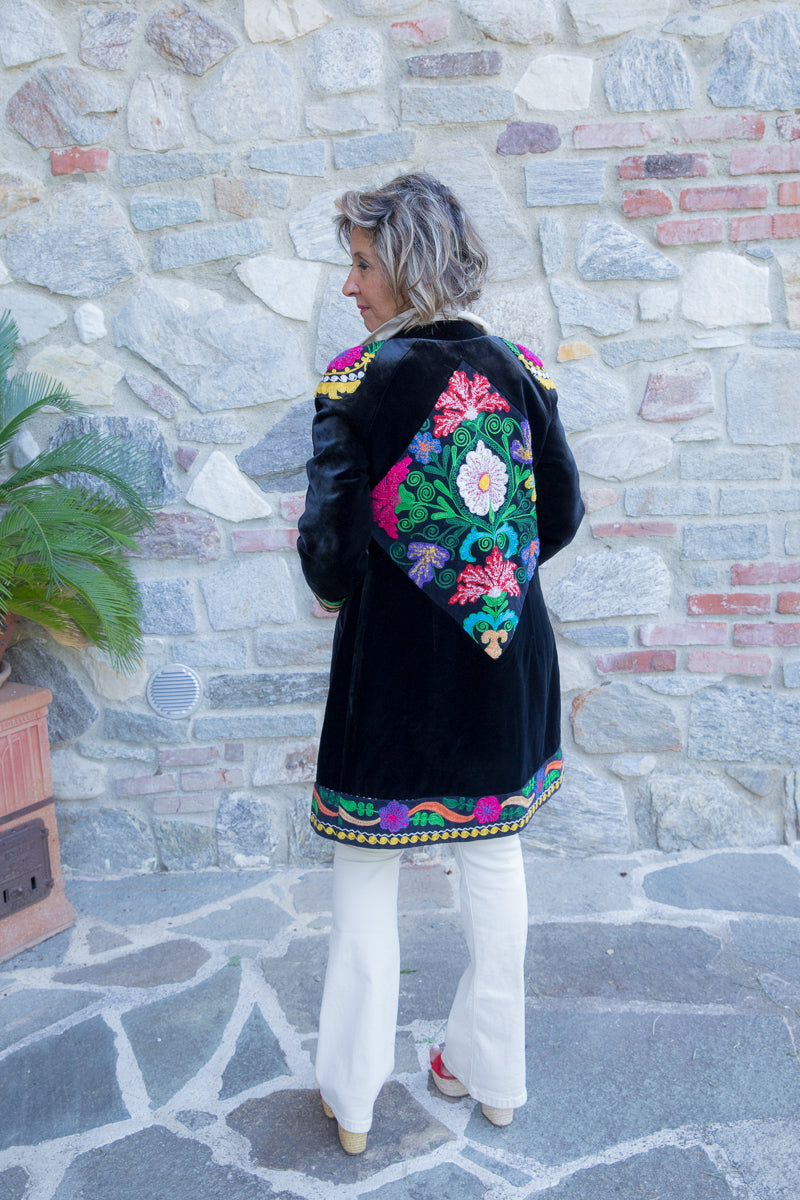 Giacca lunga ed avvolgente, perfetta anche come soprabito versatile e facile da indossare. Allegra, colorata e raffinata, questa giacca aggiunge un tocco di particolarità e charme al tuo look. Indossarla significa distinguersi con gusto e unicità, ricevendo complimenti ammirati ovunque tu vada. Ogni capo esprime grinta e personalità, garantendo l'esclusività di pezzi unici e introvabili. I dettagli come i preziosi bottoni gioiello, sostituiti uno per uno, conferiscono uno standard di qualità e stile ineguagliabile.