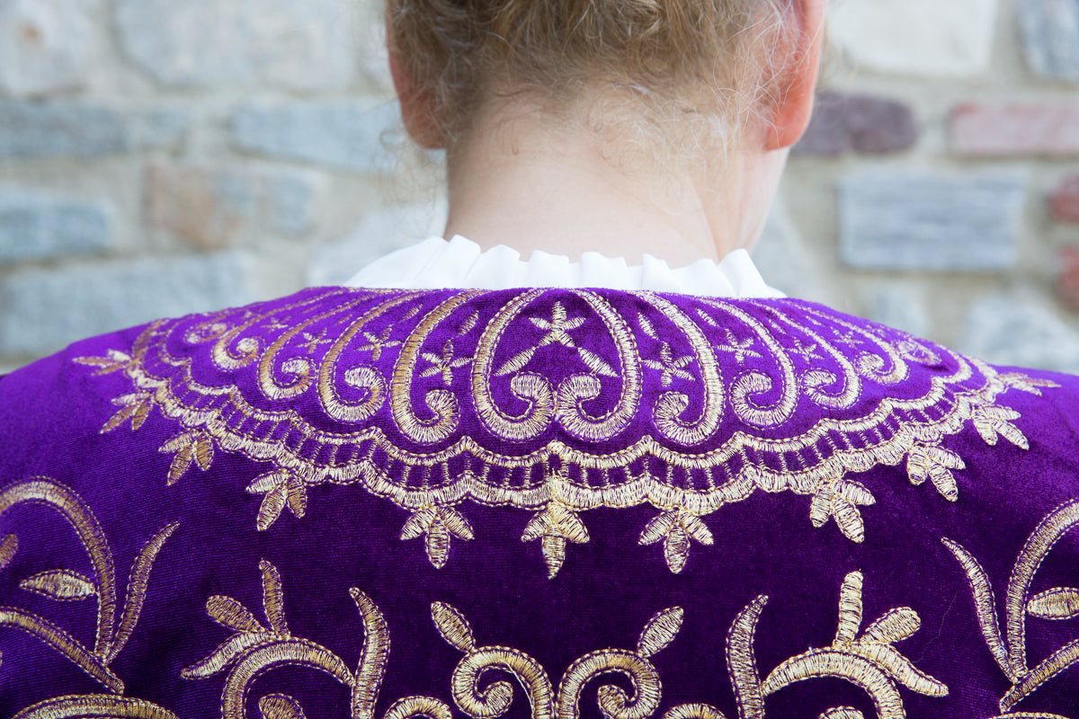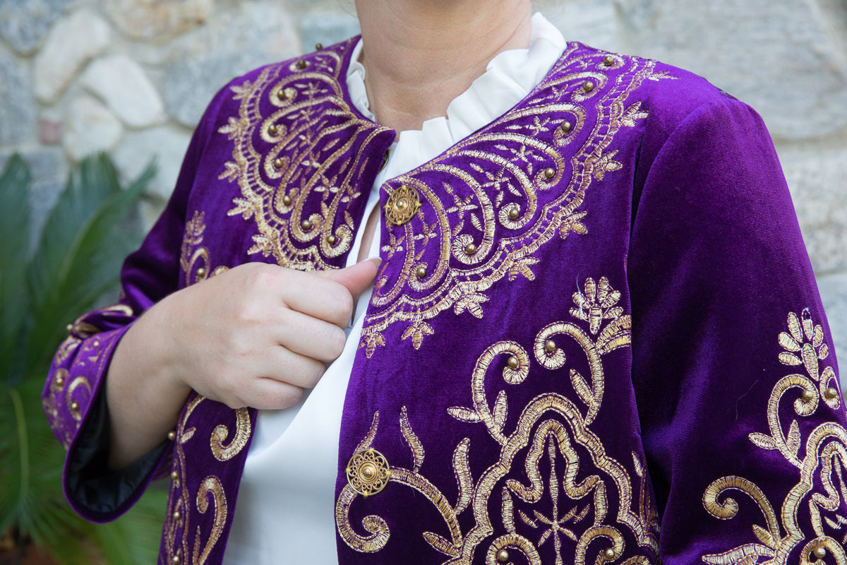 Preferisci il lavaggio a secco per evitare danni ai tessuti pregiati e alle decorazioni. Evita l'esposizione diretta alla luce solare per lunghi periodi e conservala in un luogo fresco e asciutto, al riparo dall'umidità. Stirare a bassa temperatura sul rovescio o utilizzare un panno protettivo.