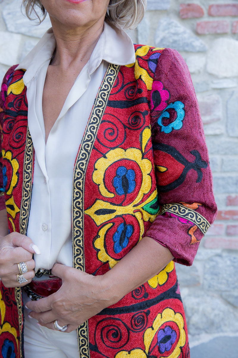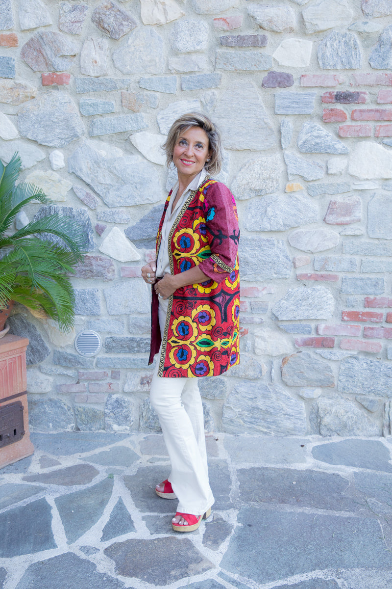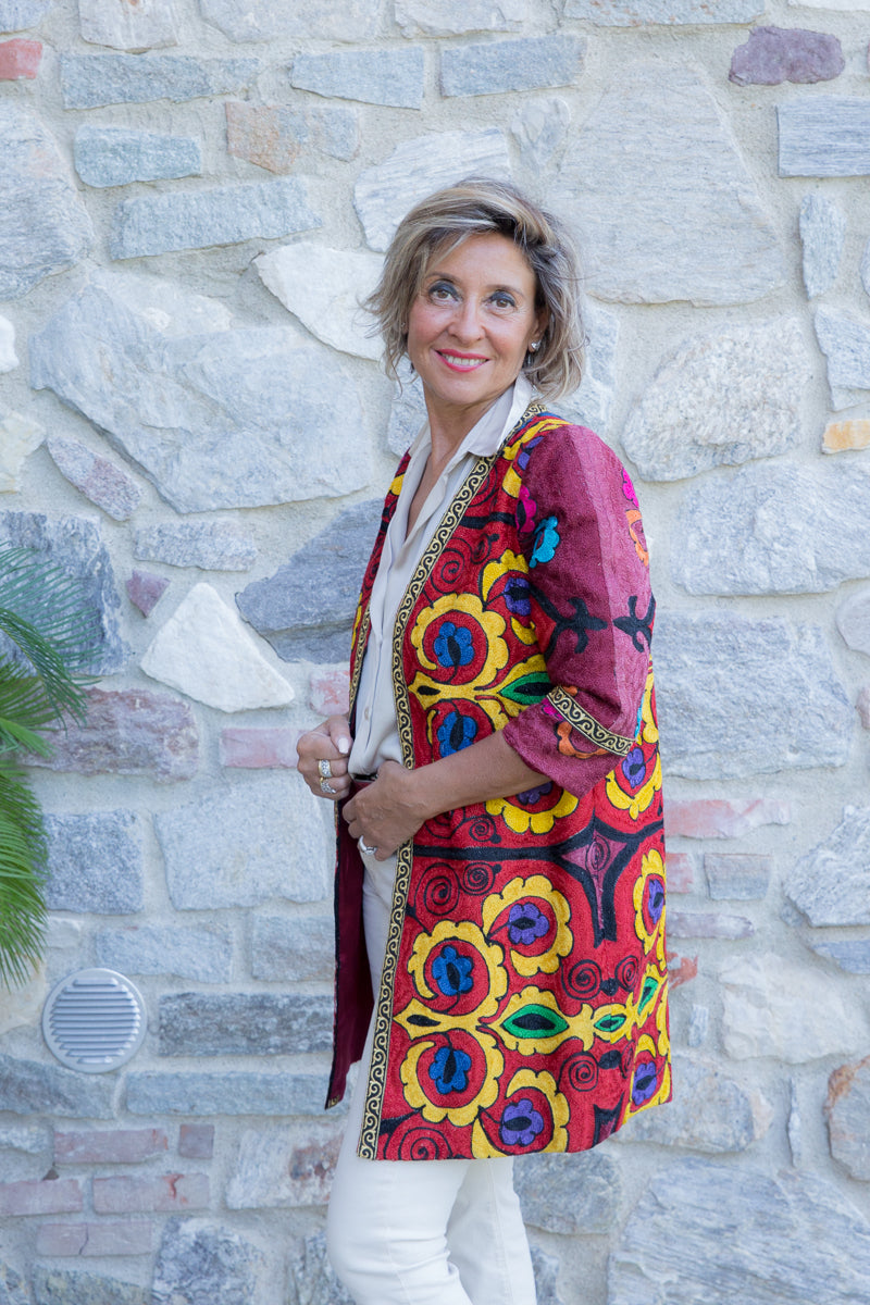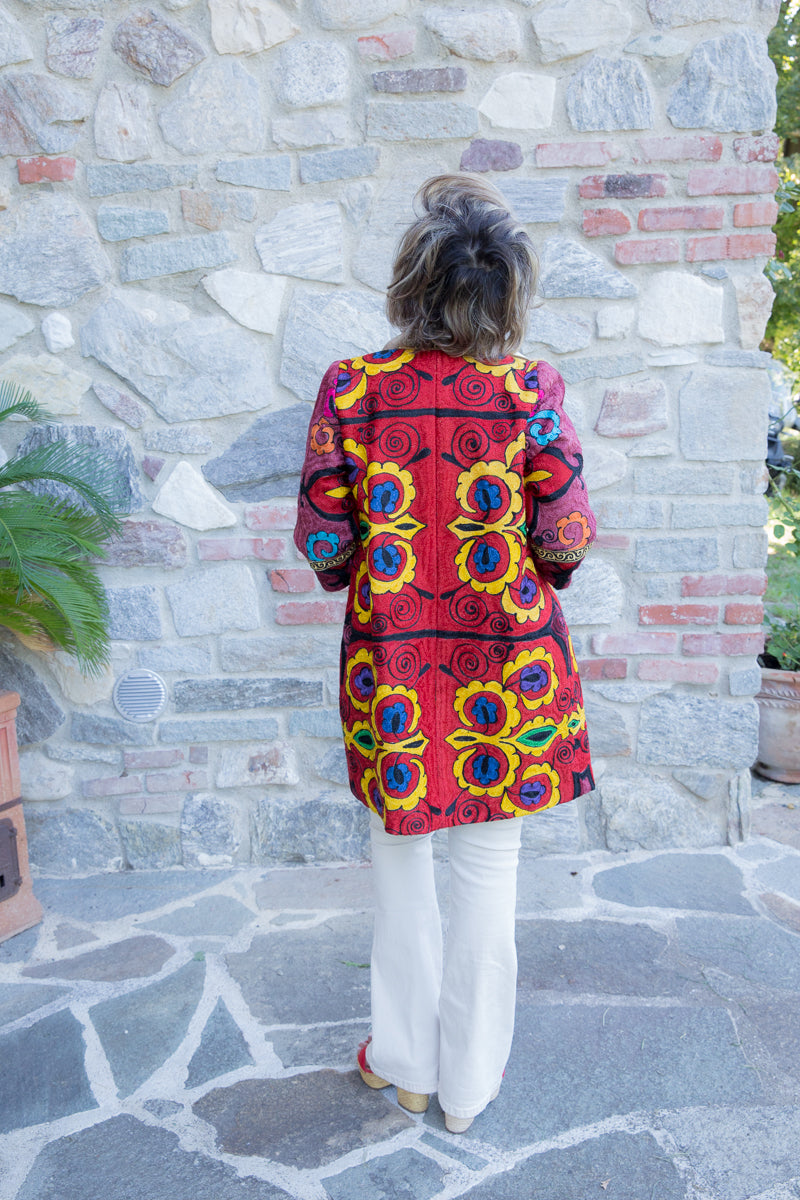 Giacca lunga ed avvolgente, perfetta anche come soprabito versatile e facile da indossare. Allegra, colorata e raffinata, questa giacca aggiunge un tocco di particolarità e charme al tuo look. Indossarla significa distinguersi con gusto e unicità, ricevendo complimenti ammirati ovunque tu vada. Ogni capo esprime grinta e personalità, garantendo l'esclusività di pezzi unici e introvabili. I dettagli come i preziosi bottoni gioiello, sostituiti uno per uno, conferiscono uno standard di qualità e stile ineguagliabile.