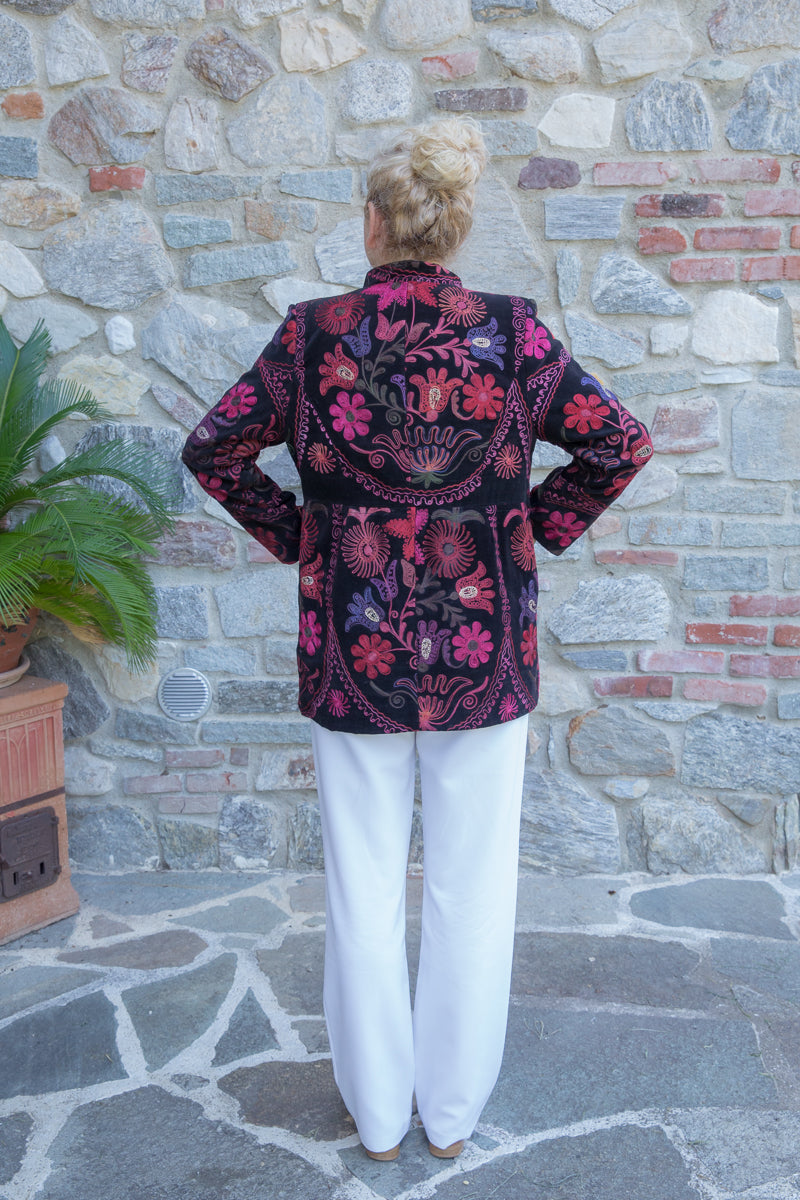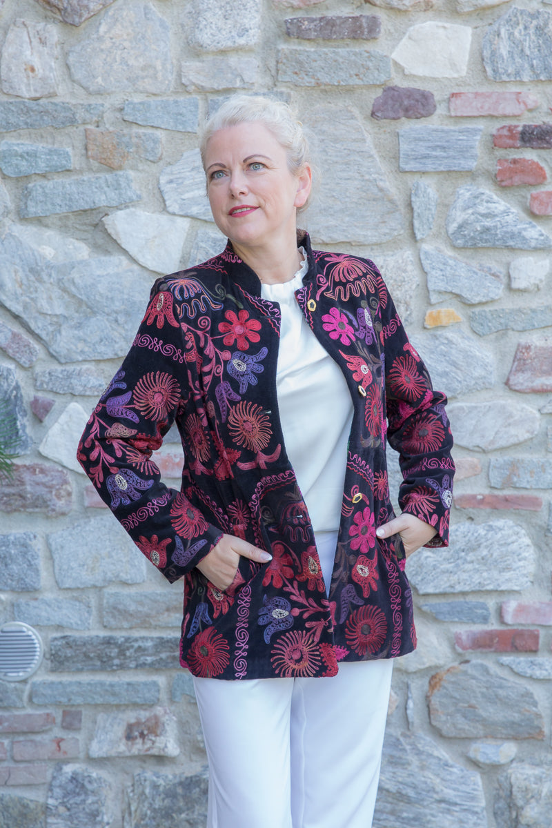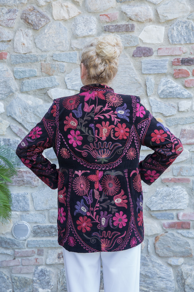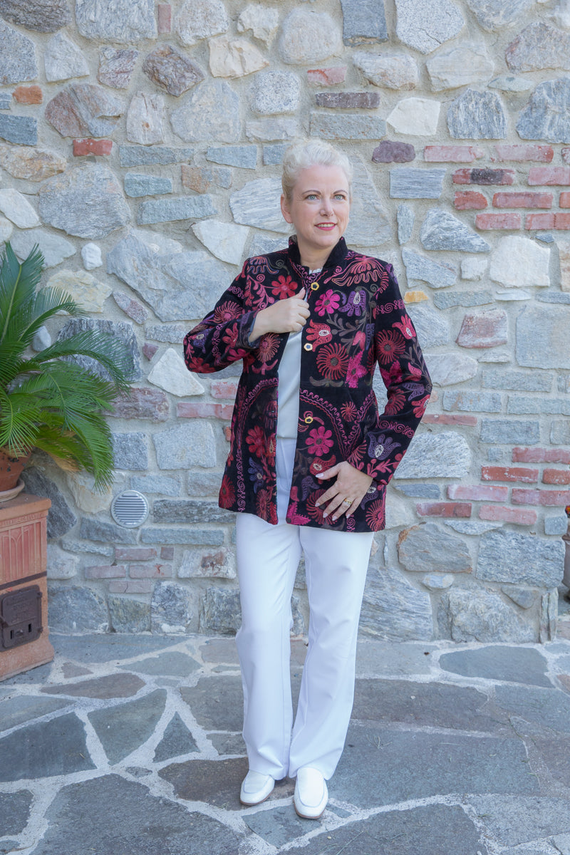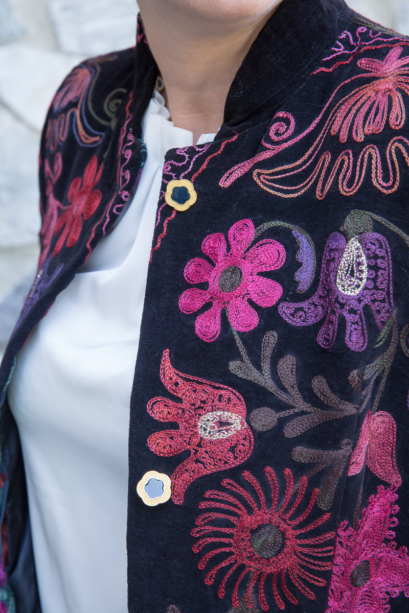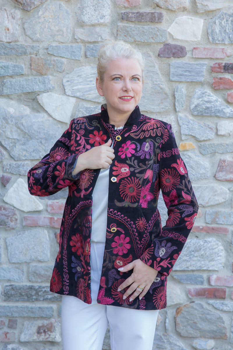 Giacca lunga ed avvolgente, perfetta anche come soprabito versatile e facile da indossare. Allegra, colorata e raffinata, questa giacca aggiunge un tocco di particolarità e charme al tuo look. Indossarla significa distinguersi con gusto e unicità, ricevendo complimenti ammirati ovunque tu vada. Ogni capo esprime grinta e personalità, garantendo l'esclusività di pezzi unici e introvabili. I dettagli come i preziosi bottoni gioiello, sostituiti uno per uno, conferiscono uno standard di qualità e stile ineguagliabile.