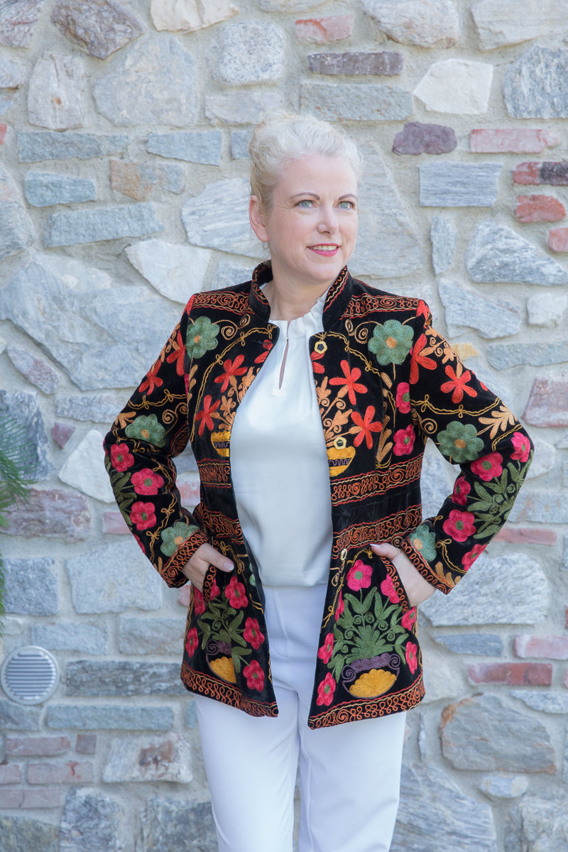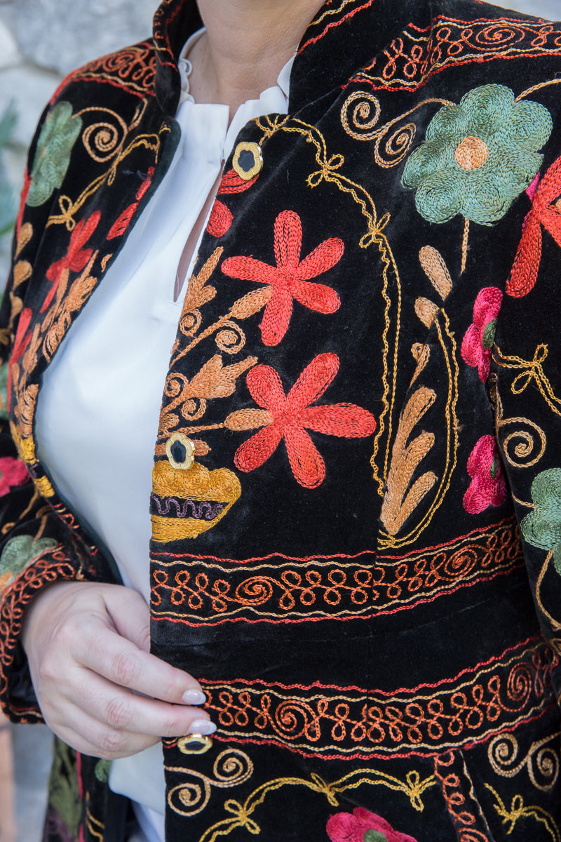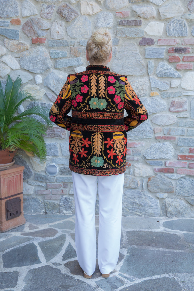 Giacca lunga ed avvolgente, perfetta anche come soprabito versatile e facile da indossare. Allegra, colorata e raffinata, questa giacca aggiunge un tocco di particolarità e charme al tuo look. Indossarla significa distinguersi con gusto e unicità, ricevendo complimenti ammirati ovunque tu vada. Ogni capo esprime grinta e personalità, garantendo l'esclusività di pezzi unici e introvabili. I dettagli come i preziosi bottoni gioiello, sostituiti uno per uno, conferiscono uno standard di qualità e stile ineguagliabile.