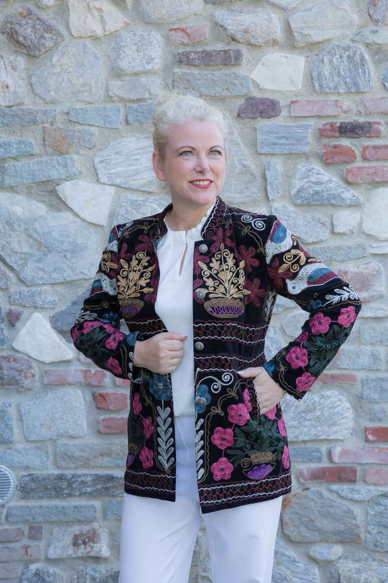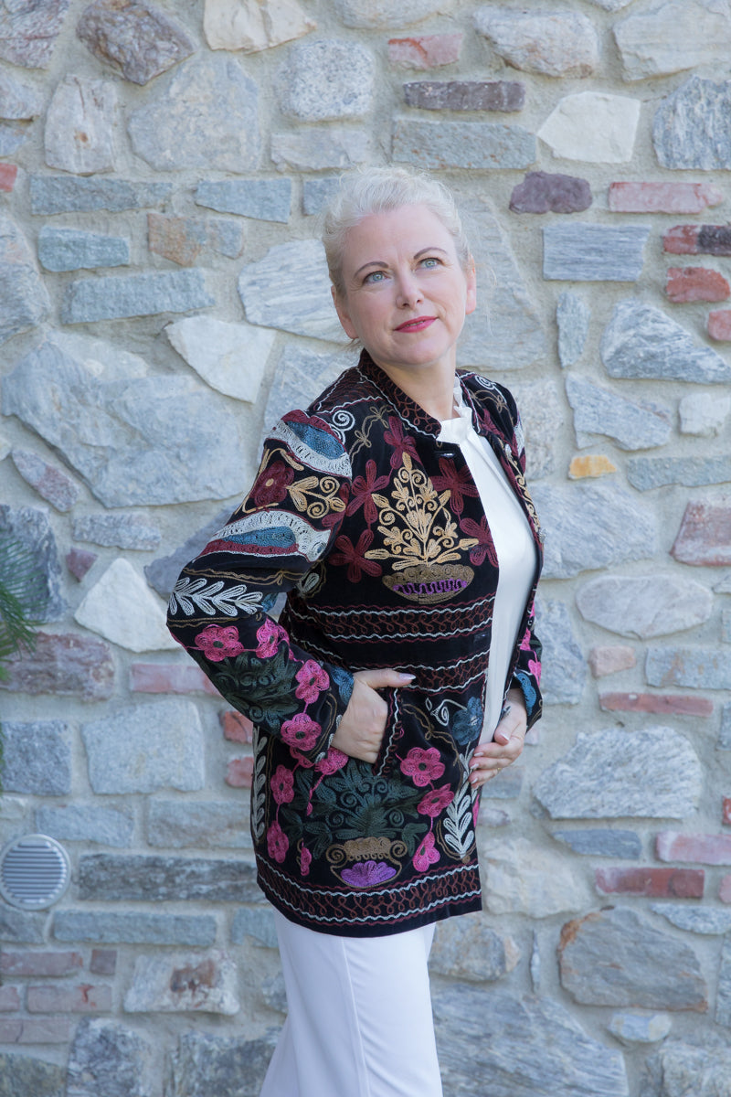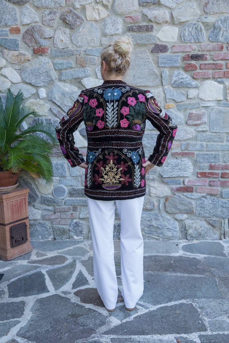 Giacca lunga ed avvolgente, perfetta anche come soprabito versatile e facile da indossare. Allegra, colorata e raffinata, questa giacca aggiunge un tocco di particolarità e charme al tuo look. Indossarla significa distinguersi con gusto e unicità, ricevendo complimenti ammirati ovunque tu vada. Ogni capo esprime grinta e personalità, garantendo l'esclusività di pezzi unici e introvabili. I dettagli come i preziosi bottoni gioiello, sostituiti uno per uno, conferiscono uno standard di qualità e stile ineguagliabile.