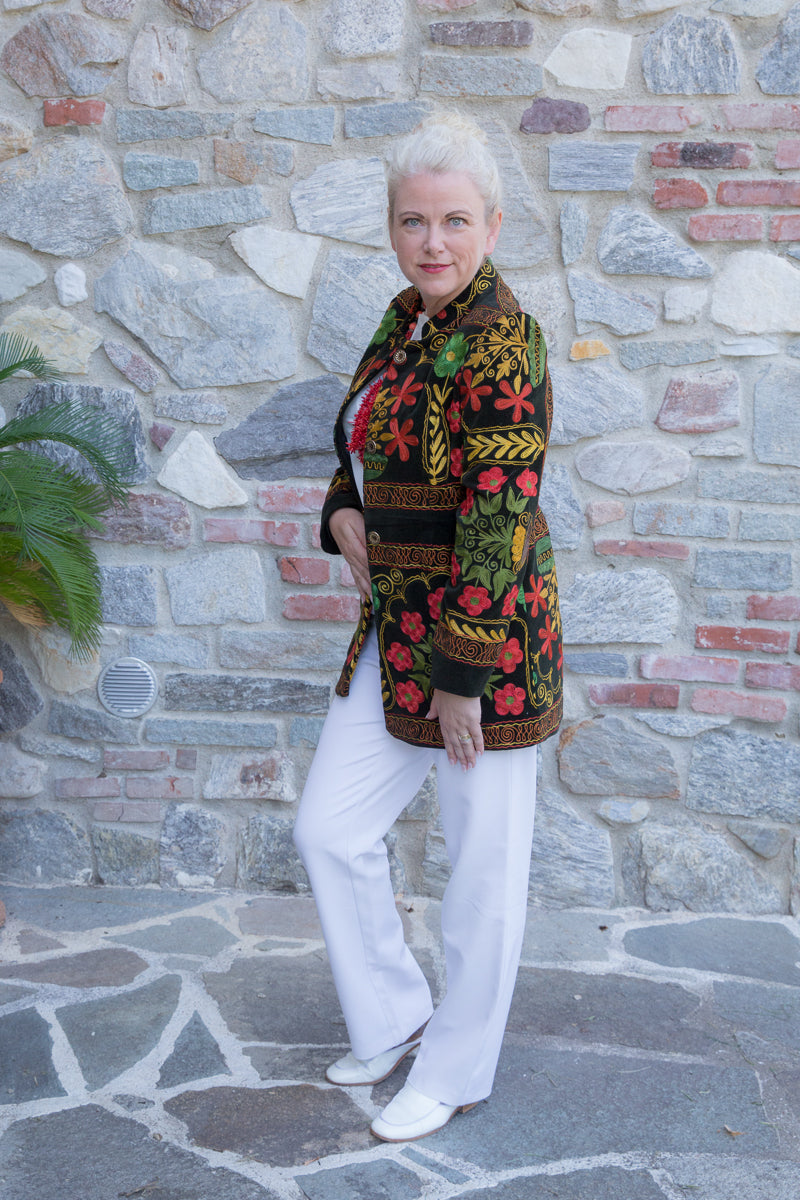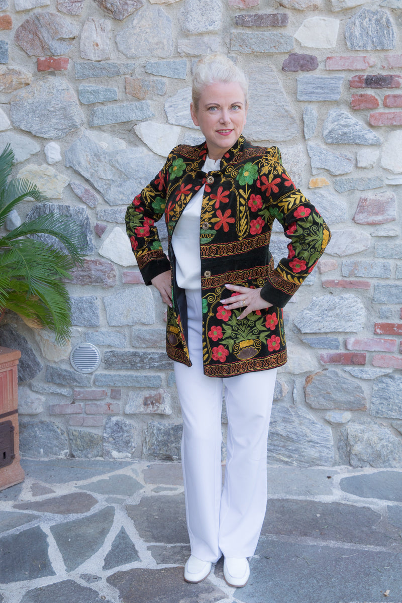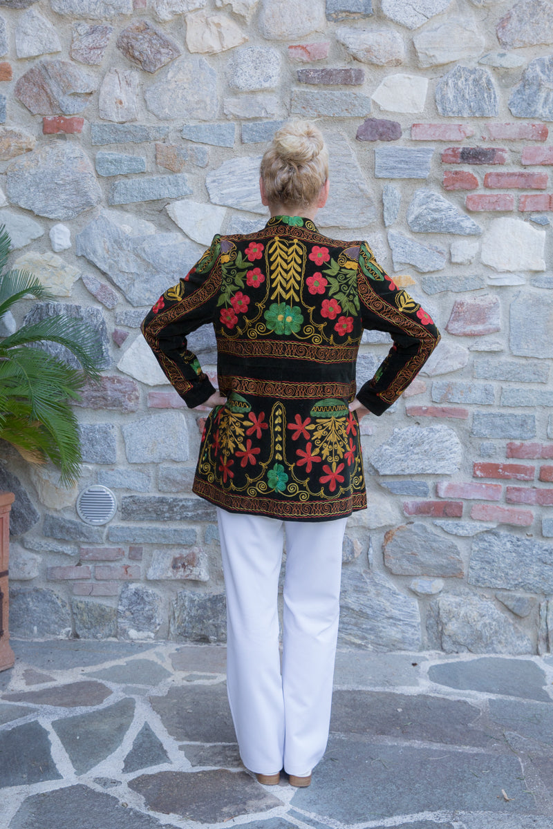 Giacca lunga ed avvolgente, perfetta anche come soprabito versatile e facile da indossare. Allegra, colorata e raffinata, questa giacca aggiunge un tocco di particolarità e charme al tuo look. Indossarla significa distinguersi con gusto e unicità, ricevendo complimenti ammirati ovunque tu vada. Ogni capo esprime grinta e personalità, garantendo l'esclusività di pezzi unici e introvabili. I dettagli come i preziosi bottoni gioiello, sostituiti uno per uno, conferiscono uno standard di qualità e stile ineguagliabile.