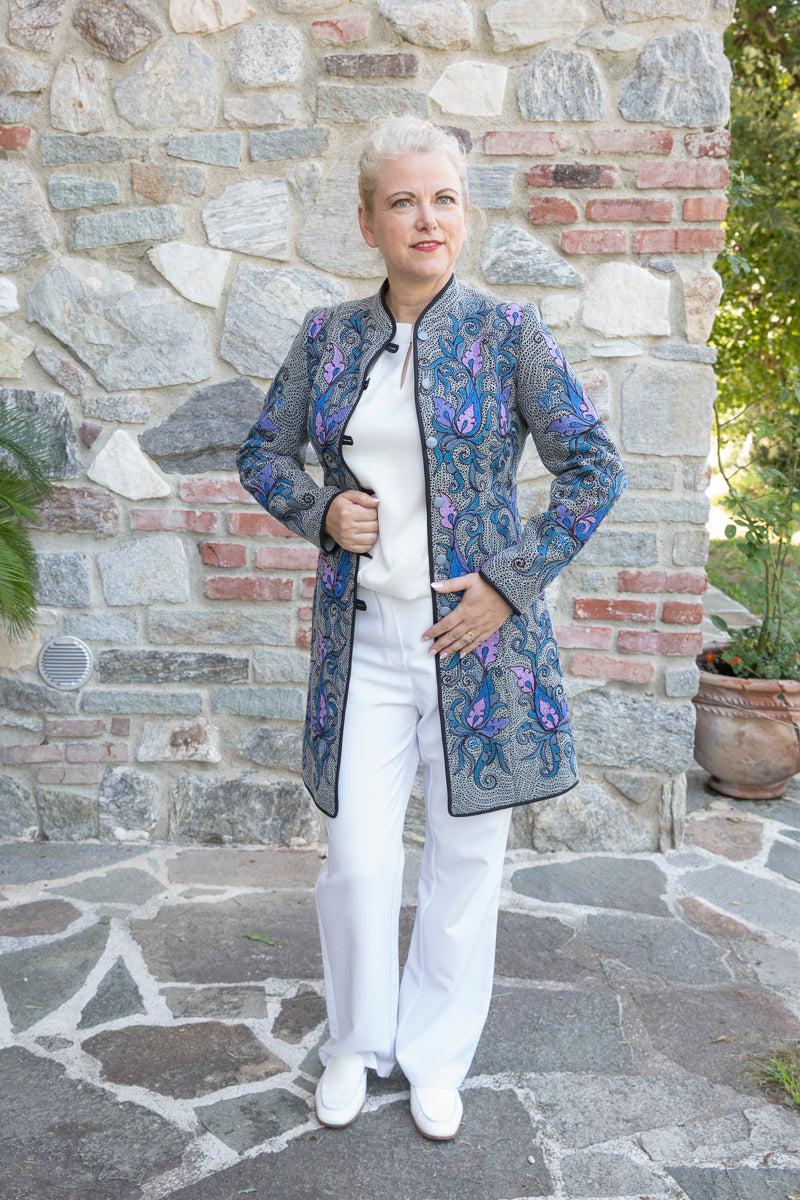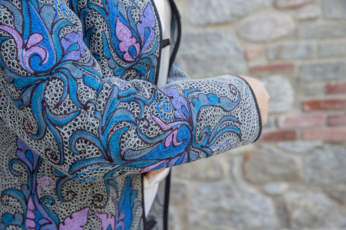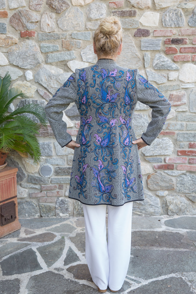 Straordinario soprabito realizzato a mano, decorato con ricami unici e pregiati arabeschi. Con tessuto fermo e fit regular, si distingue per le linee asciutte ed eleganti che valorizzano chi lo indossa. I colori vivaci e i dettagli artigianali trasformano questo soprabito in un autentico gioiello. Ogni capo è accuratamente selezionato e impreziosito da bottoni gioiello, per offrire un tocco esclusivo firmato JoyFull. Realizzati interamente a mano in Uzbekistan, questi capi sono espressione di una tradizione artigianale unica.