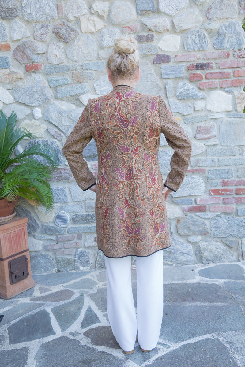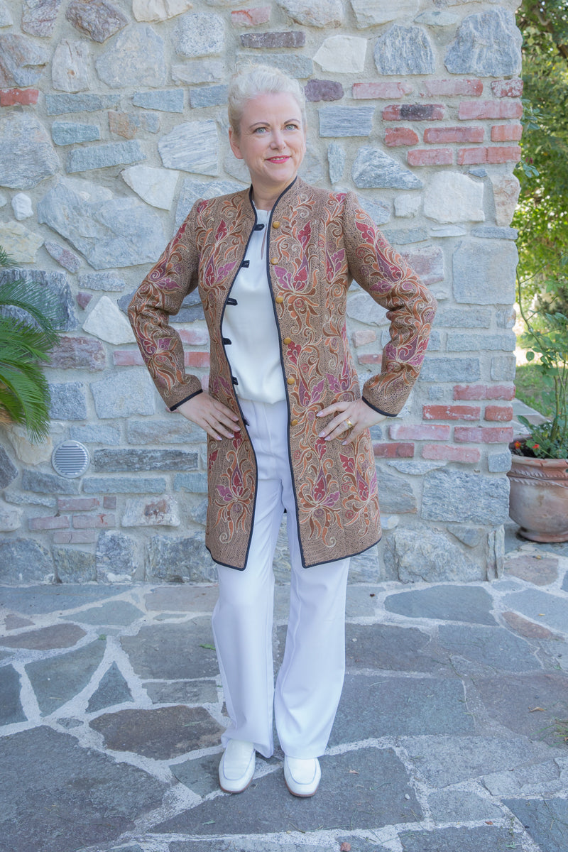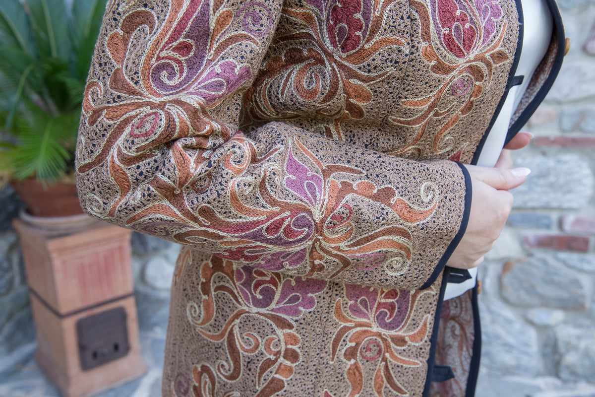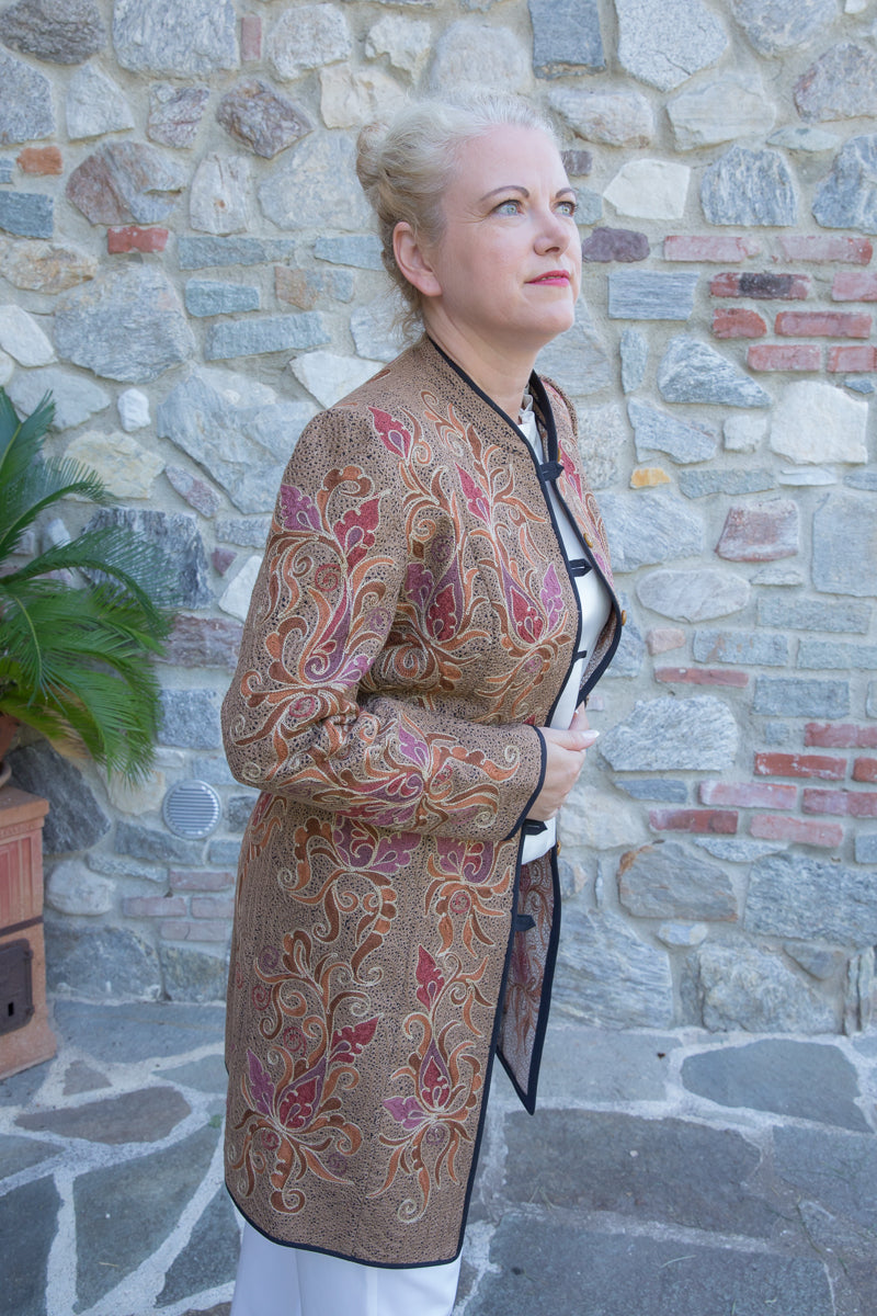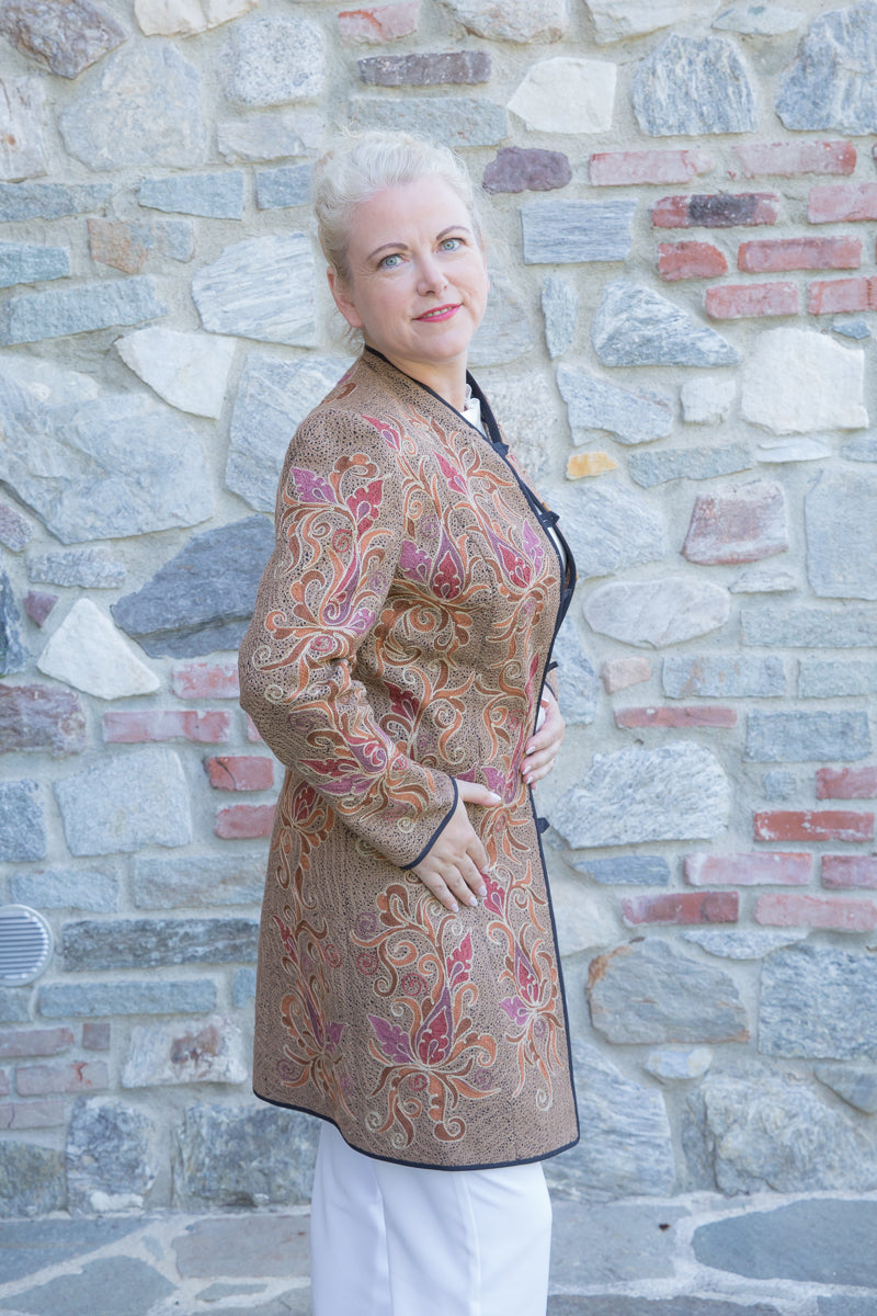 Straordinario soprabito realizzato a mano, decorato con ricami unici e pregiati arabeschi. Con tessuto fermo e fit regular, si distingue per le linee asciutte ed eleganti che valorizzano chi lo indossa. I colori vivaci e i dettagli artigianali trasformano questo soprabito in un autentico gioiello. Ogni capo è accuratamente selezionato e impreziosito da bottoni gioiello, per offrire un tocco esclusivo firmato JoyFull. Realizzati interamente a mano in Uzbekistan, questi capi sono espressione di una tradizione artigianale unica.