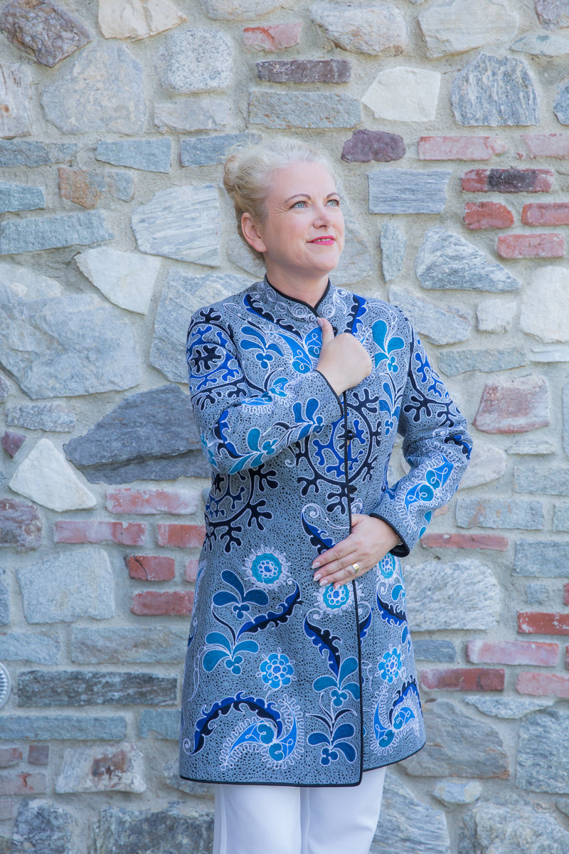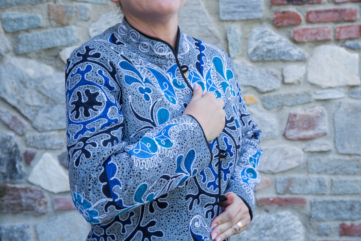 Straordinario soprabito realizzato a mano, decorato con ricami unici e pregiati arabeschi. Con tessuto fermo e fit regular, si distingue per le linee asciutte ed eleganti che valorizzano chi lo indossa. I colori vivaci e i dettagli artigianali trasformano questo soprabito in un autentico gioiello. Ogni capo è accuratamente selezionato e impreziosito da bottoni gioiello, per offrire un tocco esclusivo firmato JoyFull. Realizzati interamente a mano in Uzbekistan, questi capi sono espressione di una tradizione artigianale unica.