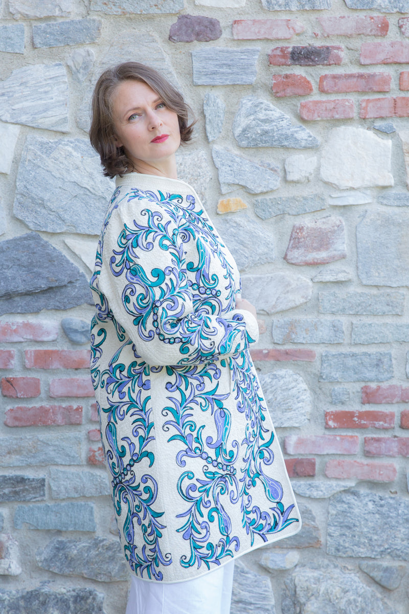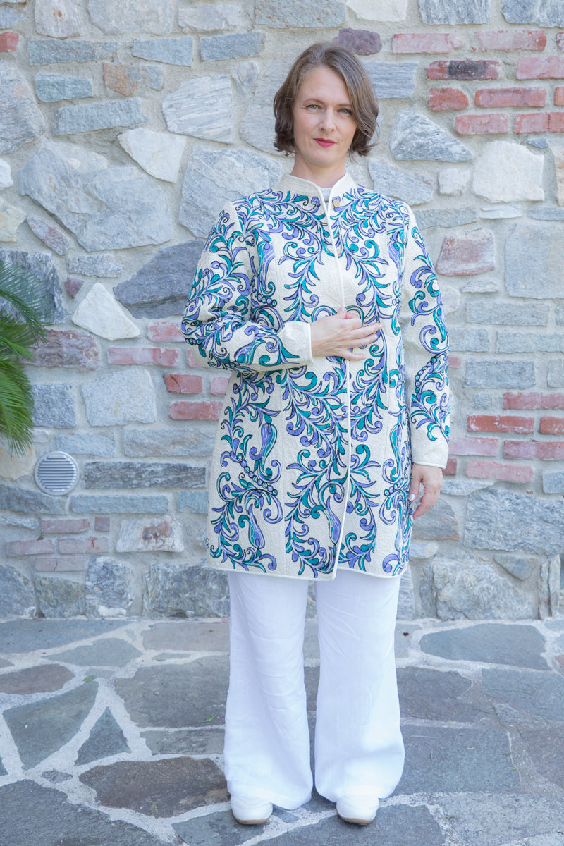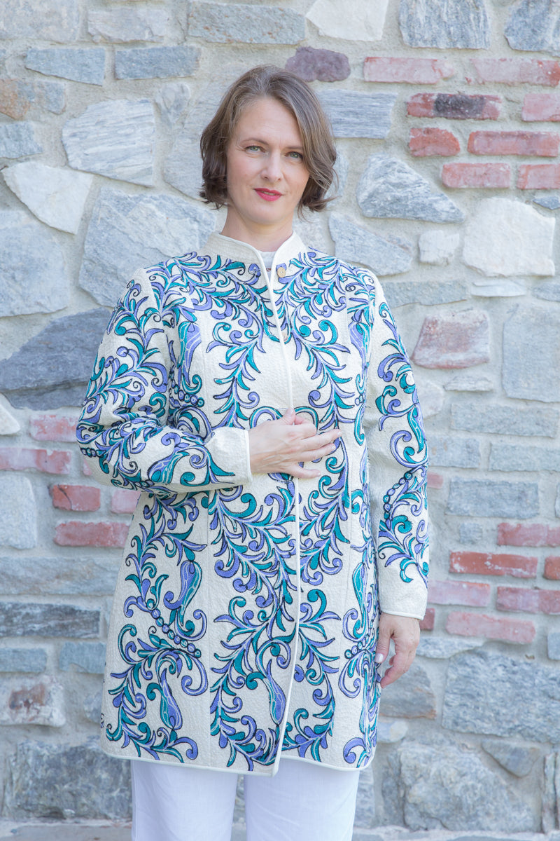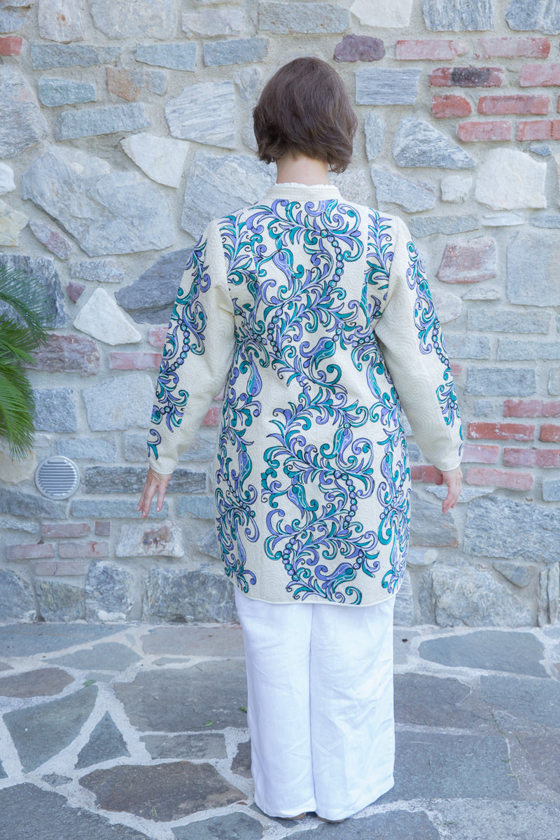 Straordinario soprabito realizzato a mano, decorato con ricami unici e pregiati arabeschi. Con tessuto fermo e fit regular, si distingue per le linee asciutte ed eleganti che valorizzano chi lo indossa. I colori vivaci e i dettagli artigianali trasformano questo soprabito in un autentico gioiello. Ogni capo è accuratamente selezionato e impreziosito da bottoni gioiello, per offrire un tocco esclusivo firmato JoyFull. Realizzati interamente a mano in Uzbekistan, questi capi sono espressione di una tradizione artigianale unica.