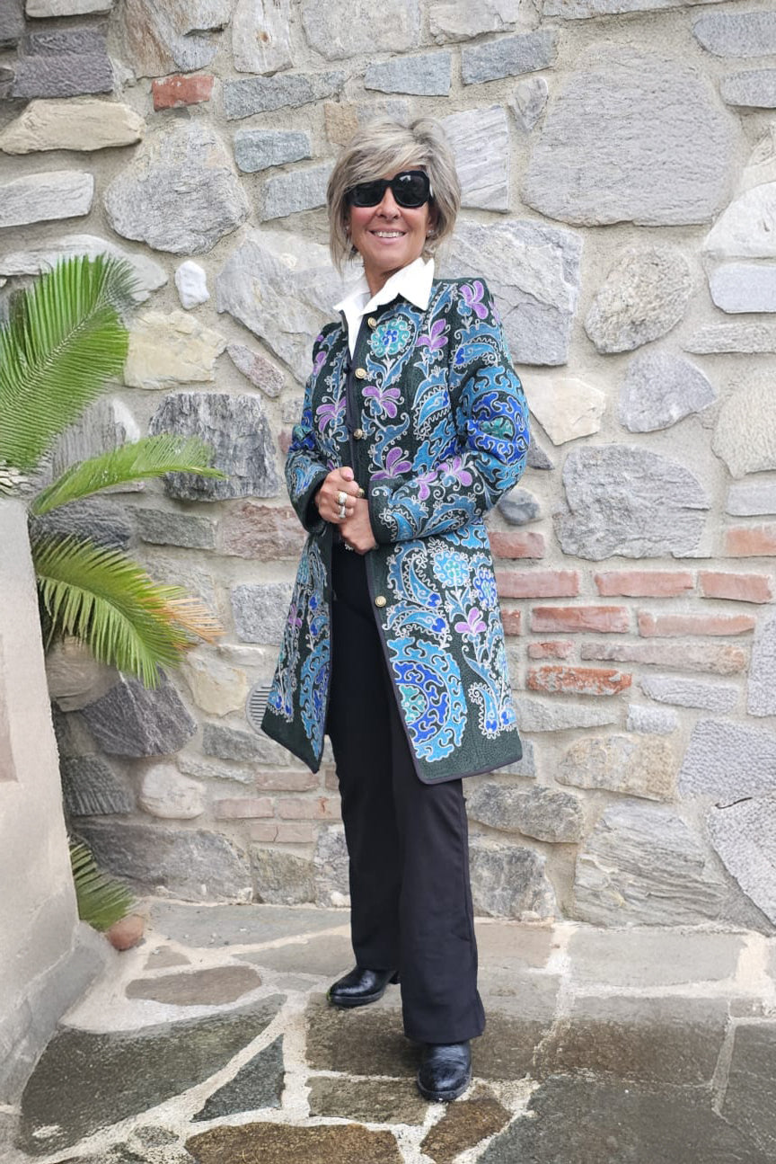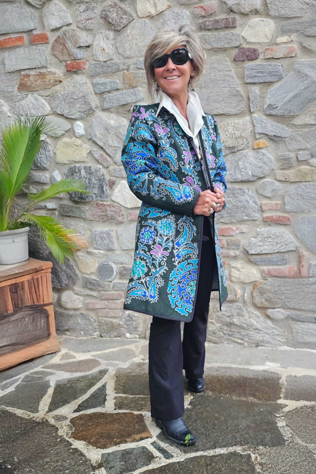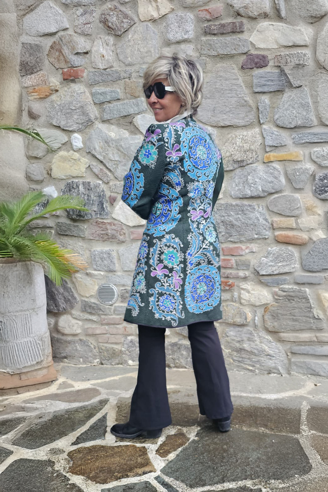 Straordinario soprabito realizzato a mano, decorato con ricami unici e pregiati arabeschi. Con tessuto fermo e fit regular, si distingue per le linee asciutte ed eleganti che valorizzano chi lo indossa. I colori vivaci e i dettagli artigianali trasformano questo soprabito in un autentico gioiello. Ogni capo è accuratamente selezionato e impreziosito da bottoni gioiello, per offrire un tocco esclusivo firmato JoyFull. Realizzati interamente a mano in Uzbekistan, questi capi sono espressione di una tradizione artigianale unica.