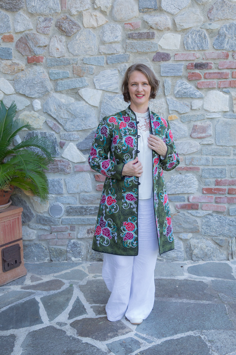 Straordinario soprabito realizzato a mano, decorato con ricami unici e pregiati arabeschi. Con tessuto fermo e fit regular, si distingue per le linee asciutte ed eleganti che valorizzano chi lo indossa. I colori vivaci e i dettagli artigianali trasformano questo soprabito in un autentico gioiello. Ogni capo è accuratamente selezionato e impreziosito da bottoni gioiello, per offrire un tocco esclusivo firmato JoyFull. Realizzati interamente a mano in Uzbekistan, questi capi sono espressione di una tradizione artigianale unica.