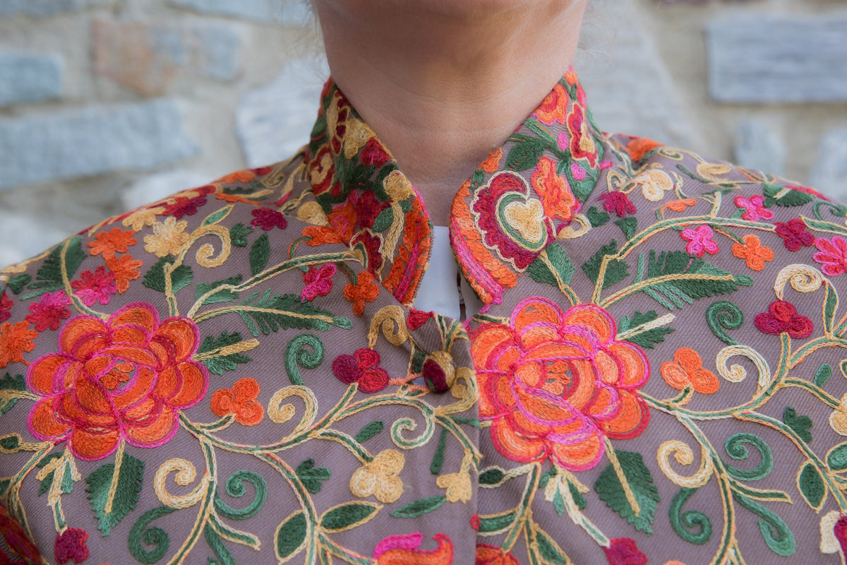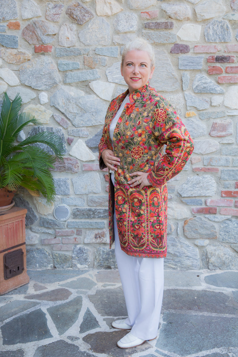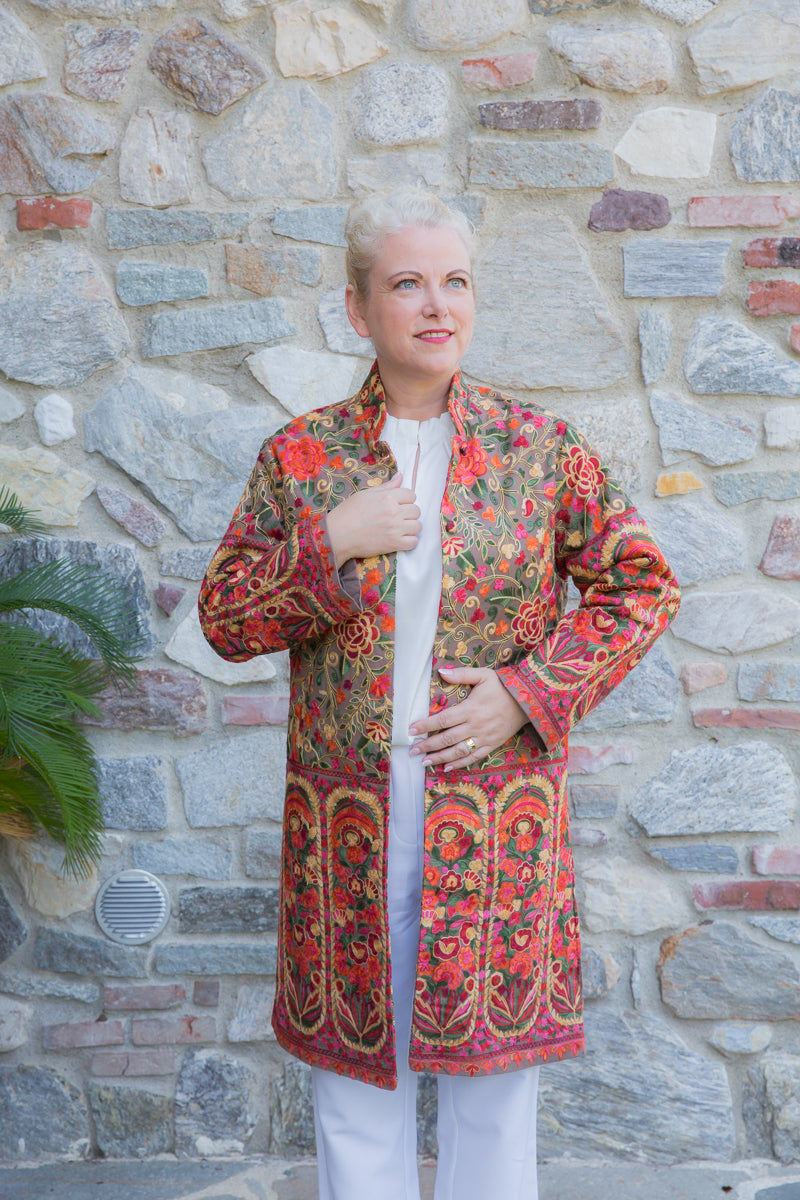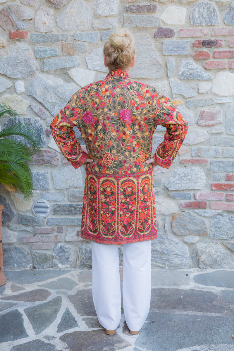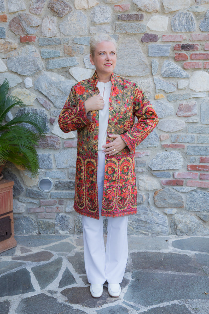 Soprabito in pura seta, interamente ricamato con preziose decorazioni che richiamano i famosi arabeschi della tradizione tessile uzbeca. Ogni soprabito è un capolavoro di rara bellezza, progettato per conferire classe ed eleganza straordinarie a chi lo indossa. Questi capi unici sono ideali per ogni donna che desidera distinguersi con stile, poiché rappresentano l'essenza di un lusso inaccessibile e di una sartorialità senza pari. Regalati un capo JoyFull: introvabile, speciale e raffinato, perfetto per esaltare la tua personalità e il tuo charme.