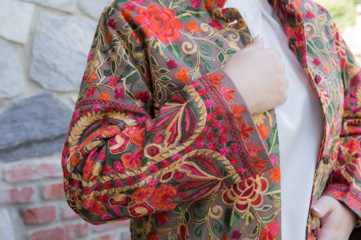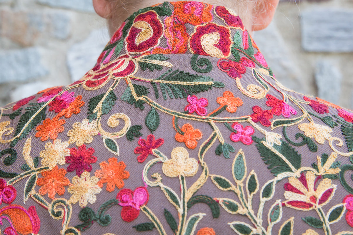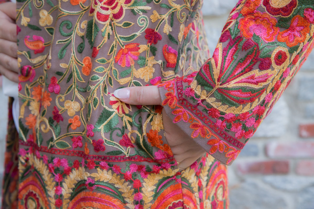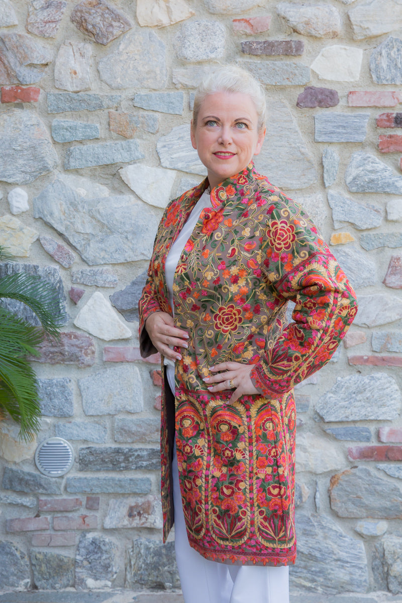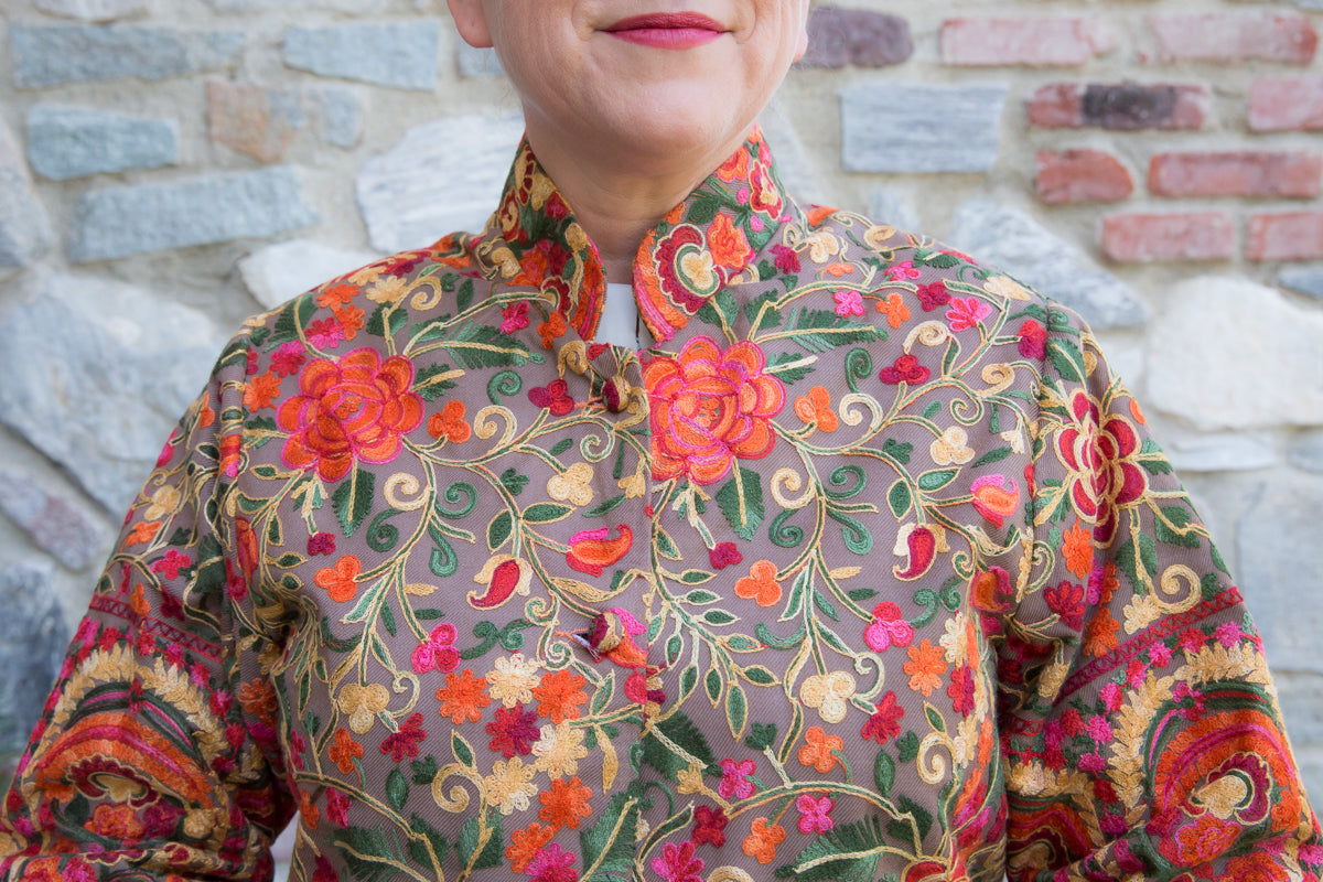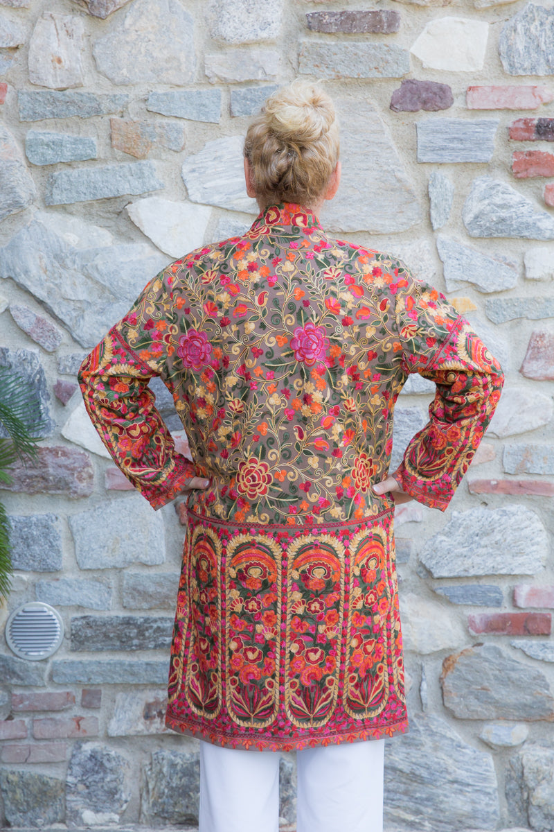 Soprabito in pura seta, interamente ricamato con preziose decorazioni che richiamano i famosi arabeschi della tradizione tessile uzbeca. Ogni soprabito è un capolavoro di rara bellezza, progettato per conferire classe ed eleganza straordinarie a chi lo indossa. Questi capi unici sono ideali per ogni donna che desidera distinguersi con stile, poiché rappresentano l'essenza di un lusso inaccessibile e di una sartorialità senza pari. Regalati un capo JoyFull: introvabile, speciale e raffinato, perfetto per esaltare la tua personalità e il tuo charme.